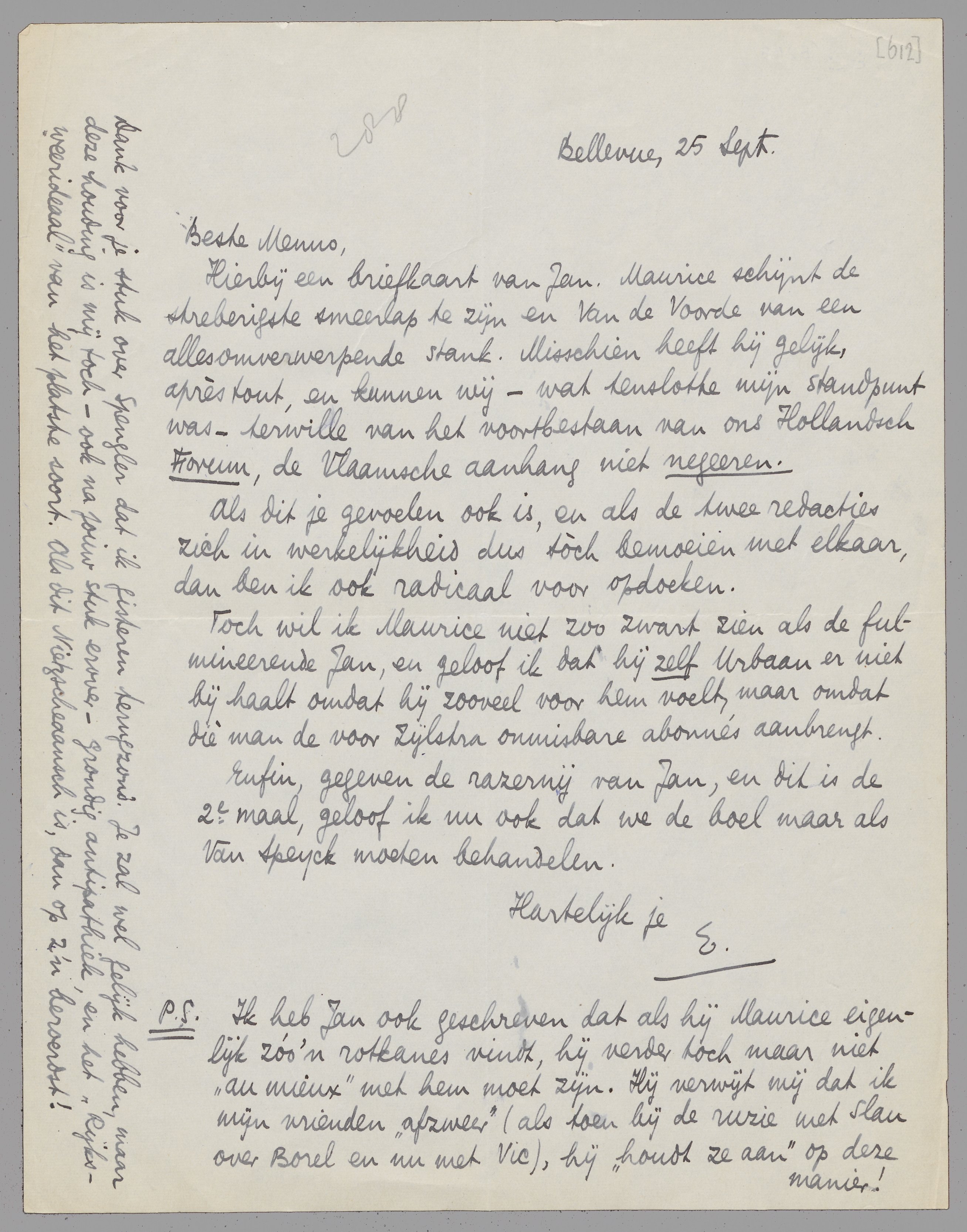 Hierbij een briefkaart van Jan. Maurice schijnt de streberigste smeerlap te zijn en van de Voorde van een alles omverwerpende stank. Misschien heeft hij gelijk, après tout, en kunnen wij - wat tenslotte mijn standpunt was - terwille van het voortbestaan van ons Hollandsch Forum, de Vlaamsche aanhang niet negeeren.