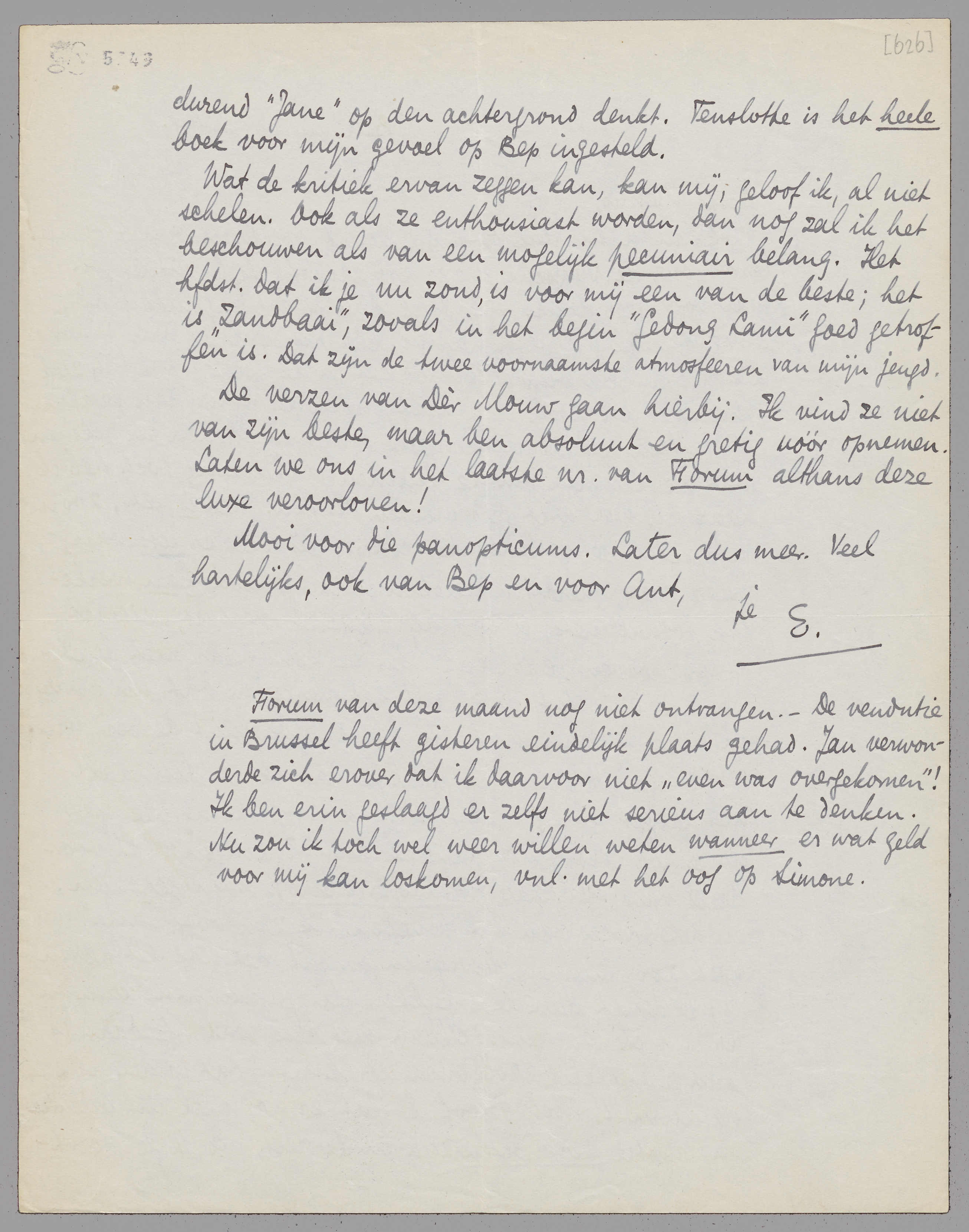 Neem me dus niet kwalijk dat ik je ditmaal niet langer schrijf; later kom ik erop terug. De sfeer die je zoo goed vindt, dank ik aan 3 dingen: het voorbeeld van Stendhal (Henri Brulard), mijn geheugen, en het proces van het verleden. Ik zou over ‘Jane’ niet zoo kunnen schrijven omdat het nog het ‘heden’ is; je denkt aan de smakkers die je kunnen lezen en er is tòch een rem. Alleen met iets wat afgedaan is, kan je werkelik volkomen afrekenen, dat is helaas een natuurwet. Toch geloof ik dat er nog veel intelligentie en emotie versmolten zijn in de rest, als je je voortdurend ‘Jane’ op den achtergrond denkt. Tenslotte is het heele boek voor mijn gevoel op Bep ingesteld.