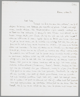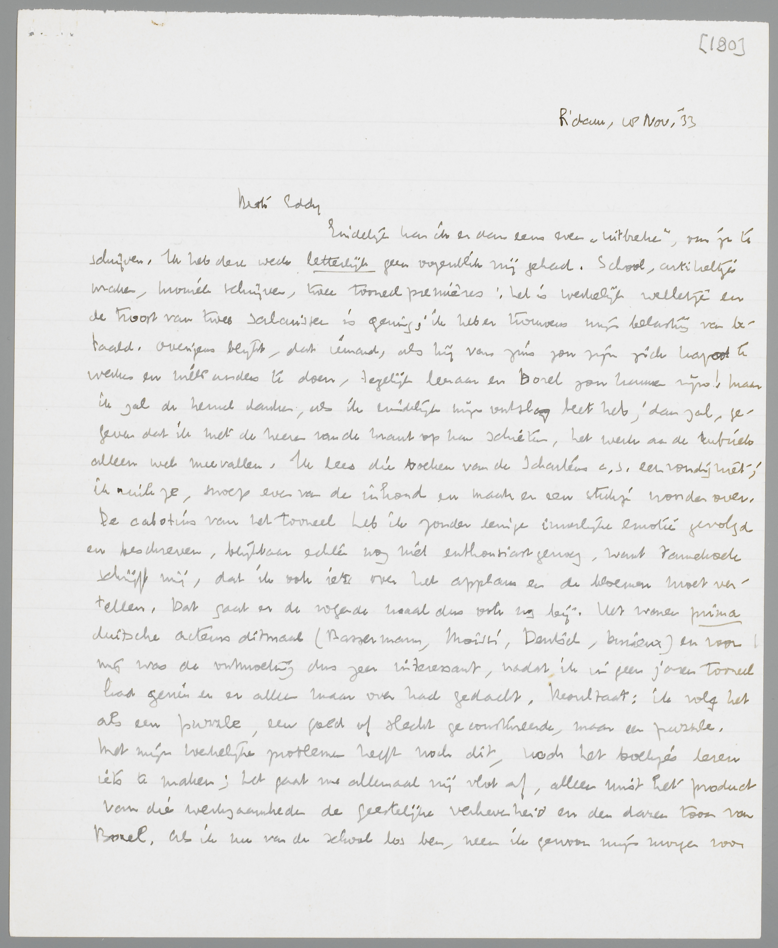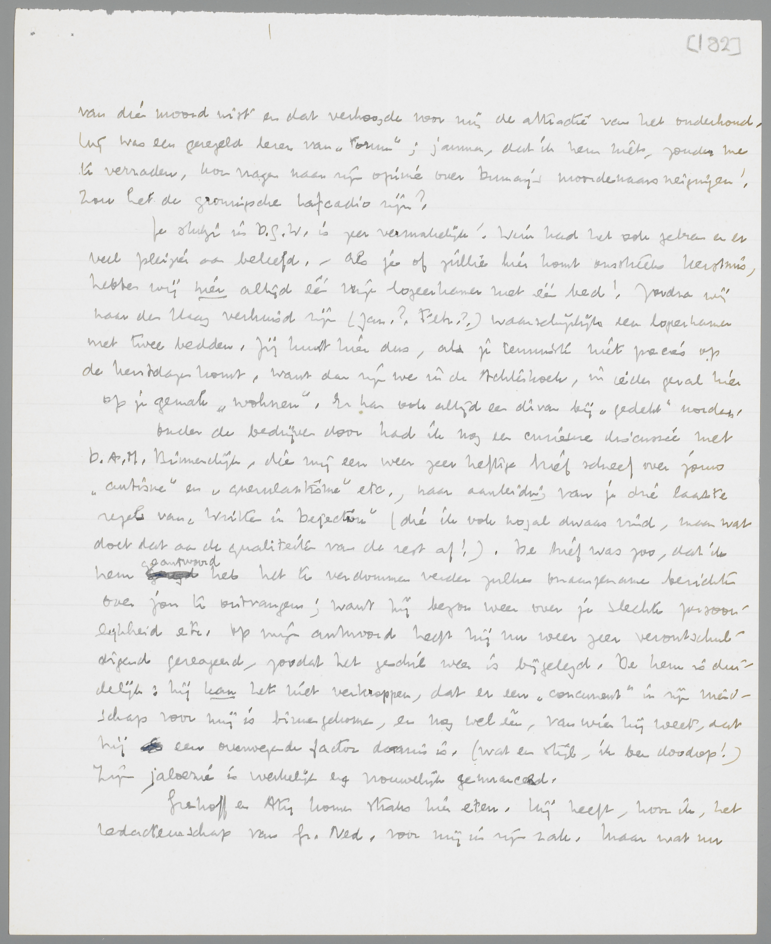 Onder de bedrijven door had ik nog een curieuze discussie met D.A.M. Binnendijk, die mij een weer zeer heftige brief schreef over jouw ‘autisme’ en ‘querulantisme’ etc., naar aanleiding van je drie laatste regels van Written in Dejection (die ik ook nogal dwaas vind, maar wat doet dat aan de qualiteiten van de rest af!). De brief was zoo, dat ik hem geantwoord heb het te verdommen verder zulke onaangename berichten over jou te ontvangen; want hij begon weer over je slechte persoonlijkheid etc. Op mijn antwoord heeft hij nu weer zeer verontschuldigend gereageerd, zoodat het geschil weer is bijgelegd. De kern is duidelijk: hij kan het niet verkroppen, dat er een ‘concurrent’ in zijn vriendschap voor mij is binnengekomen, en nog wel één, van wien hij weet, dat hij een overwegende factor daarin is. (wat een stijl, ik ben doodop!) Zijn jaloezie is werkelijk erg vrouwelijk genuanceerd.