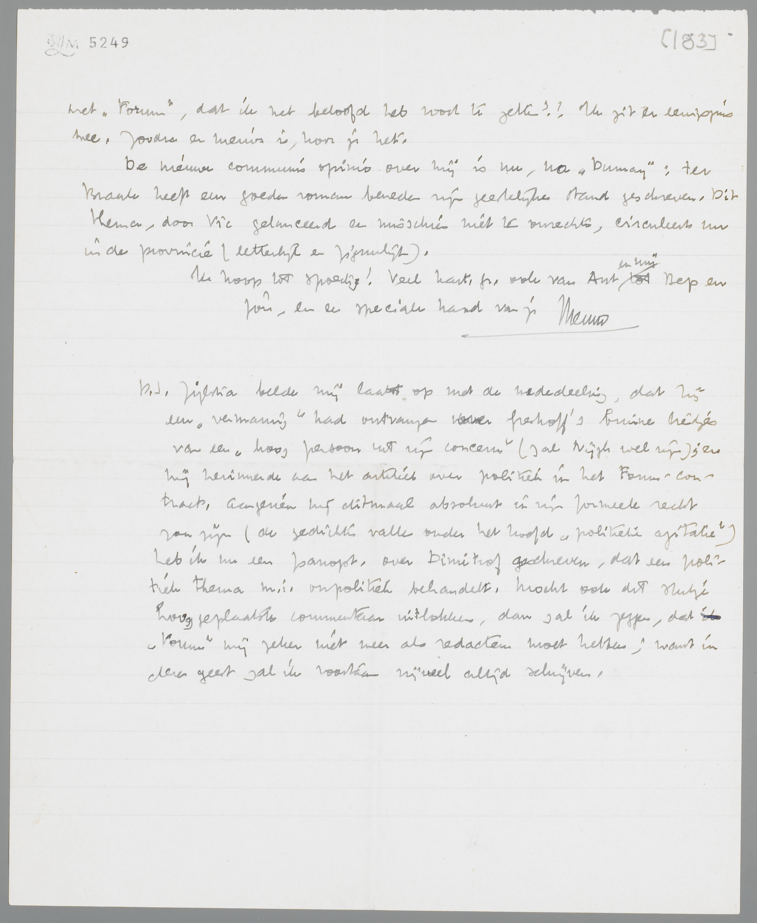 P.S. Zijlstra belde mij laatst op met de mededeeling, dat hij een ‘vermaning’ had ontvangen over Greshoff's bruine liedjes van een ‘hoog persoon uit zijn concern’ (zal Nijgh wel zijn); en hij herinnerde aan het artikel over politiek in het Forum-contract. Aangezien hij ditmaal absoluut in zijn formeele recht zou zijn (de gedichten vallen onder het hoofd ‘politieke agitatie’) heb ik nu een panopt. over Dimitrof geschreven, dat een politiek thema m.i. onpolitiek behandelt. Mocht ook dit stukje hooggeplaatste commentaar uitlokken, dan zal ik zeggen, dat Forum mij zeker niet meer als redacteur moet hebben; want in dezen geest zal ik voortaan vrij veel schrijven.