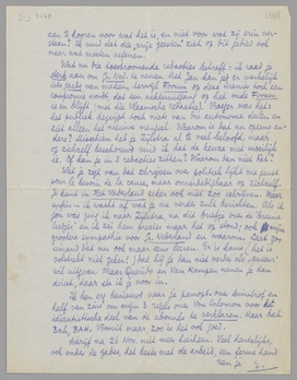 Wat je zegt van dat schrijven over politiek lijkt me juist pour le besoin de la cause, maar onverdedigbaar op zichzelf. Je kunt in Het Vaderland zeker ook niet zoo schrijven. Maar enfin... ik wacht af wat je me verder zult berichten. Als ik jou was ging ik naar Zijlstra, na dit briefje over de ‘bruine liedjes’ en ik zei hem precies waar het op stond; ook mijn grootere sympathie voor Gr. Nederland en waarom. Laat zoo iemand dat nu ook maar eens leeren. Er is kans (het is volstrekt niet zeker!) dat hij je dan niet verder als ‘auteur’ wil uitgeven. Maar Querido en Van Kampen nemen je dan direct, daar sta ik je voor in.