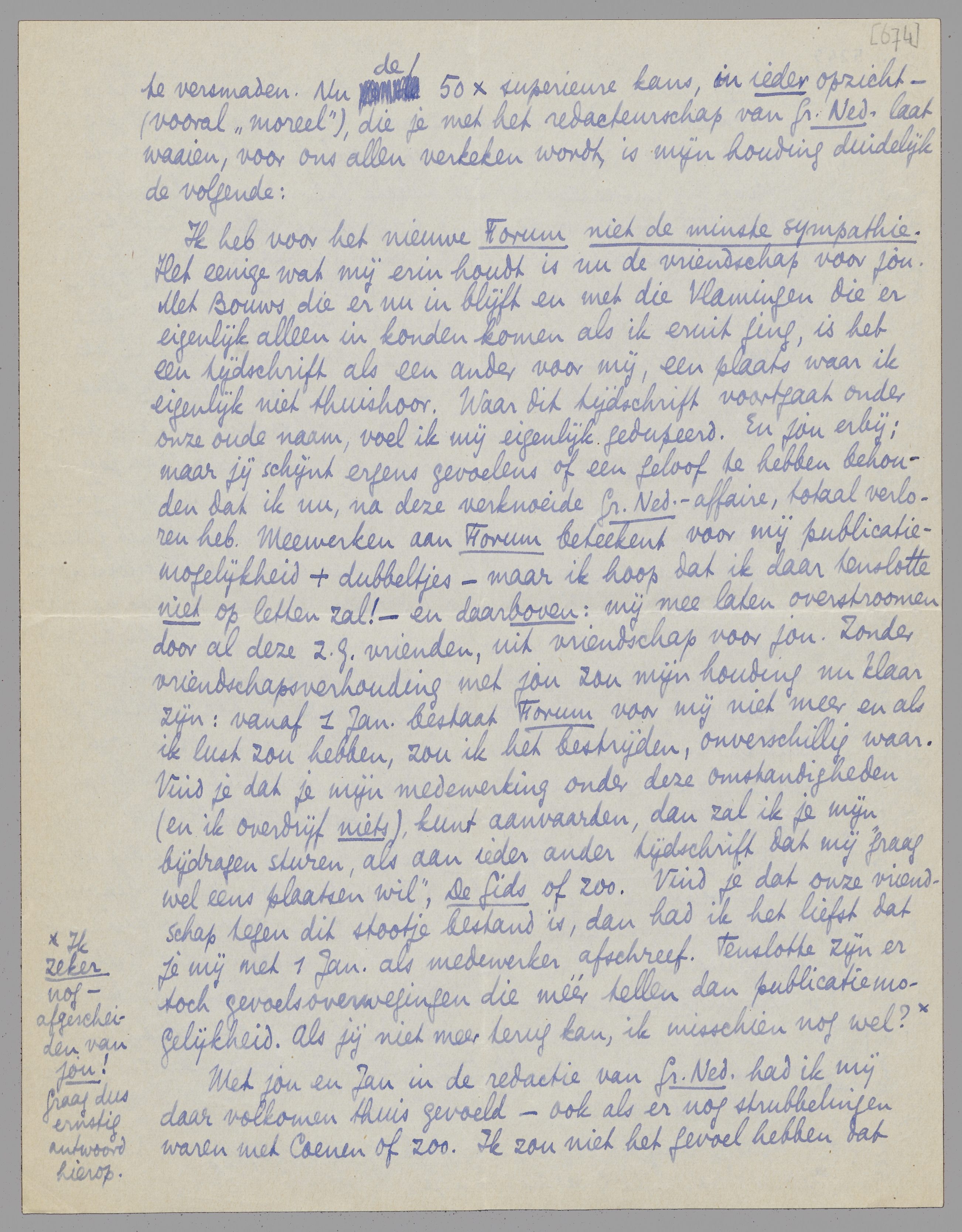Ik heb voor het nieuwe Forum niet de minste sympathie. Het eenige wat mij erin houdt is nu de vriendschap voor jou. Met Bouws die er nu in blijft en met die Vlamingen die er eigenlijk alleen in konden komen als ik eruit ging, is het een tijdschrift als een ander voor mij, een plaats waar ik eigenlijk niet thuishoor. Waar dit tijdschrift voortgaat onder onze oude naam, voel ik mij eigenlijk gedupeerd. En jou erbij; maar jij schijnt ergens gevoelens of een geloof te hebben behouden dat ik nu, na deze verknoeide Gr. Ned.-affaire, totaal verloren heb. Meewerken aan Forum beteekent voor mij publicatiemogelijkheid + dubbeltjes - maar ik hoop dat ik daar tenslotte niet op letten zal! - en daarboven: mij mee laten overstroomen door al deze z.g. vrienden, uit vriendschap voor jou. Zonder vriendschapsverhouding met jou zou mijn houding nu klaar zijn: vanaf 1 Jan. bestaat Forum voor mij niet meer en als ik lust zou hebben, zou ik het bestrijden, onverschillig waar. Vind je dat je mijn medewerking onder deze omstandigheden (en ik overdrijf niets), kunt aanvaarden, dan zal ik je mijn bijdragen sturen, als aan ieder ander tijdschrift dat mij ‘graag wel eens plaatsen wil’, De Gids of zoo. Vind je dat onze vrienschap tegen dit stootje bestand is, dan had ik het liefst dat je mij met 1 Jan. als medewerker afschreef. Tenslotte zijn er toch gevoelsoverwegingen die méér tellen dan publicatiemogelijkheid. Als jij niet meer terug kan, ik misschien nog wel?*