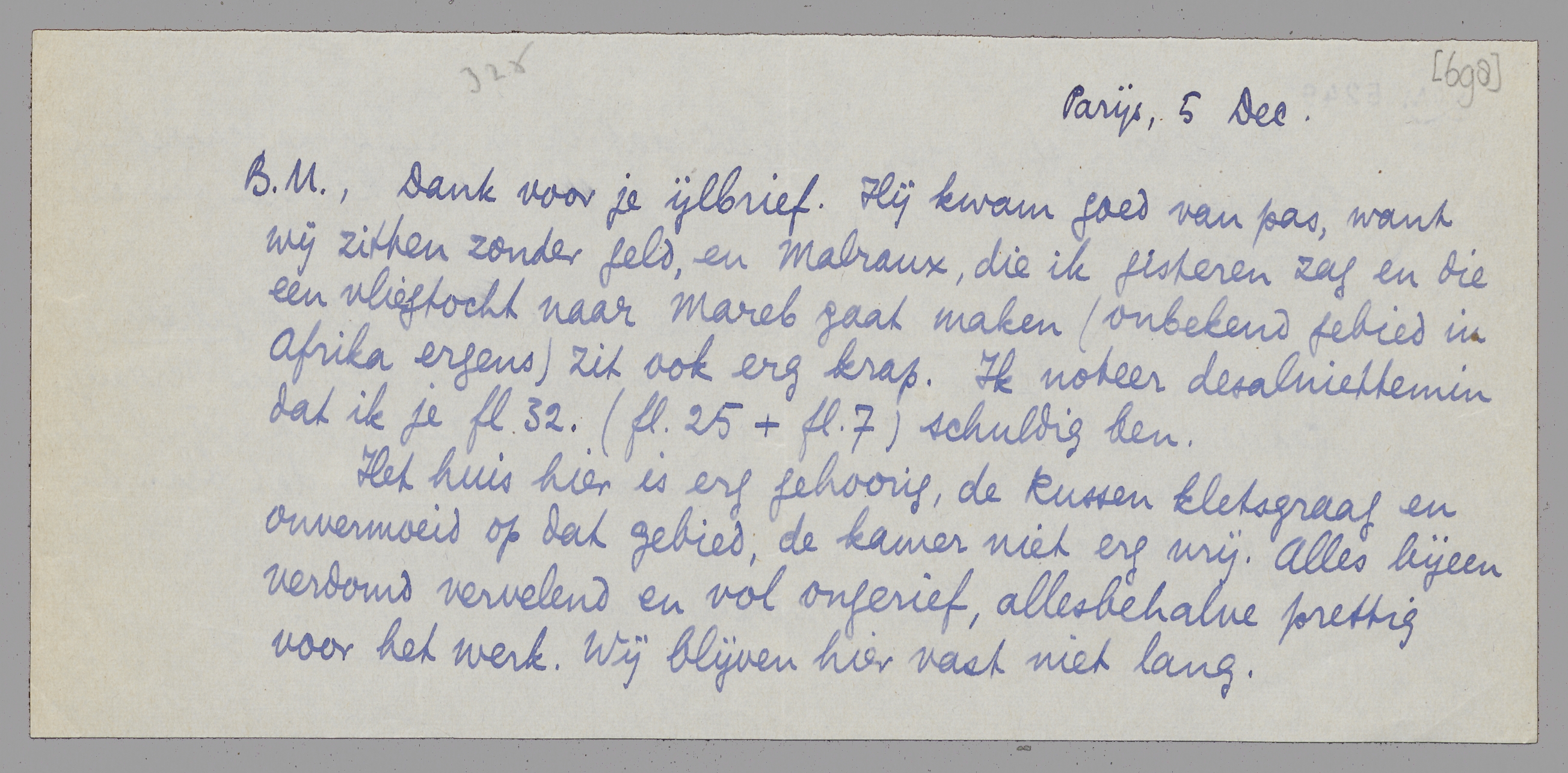 Dank voor je ijlbrief. Hij kwam goed van pas, want wij zitten zonder geld, en Malraux, die ik gisteren zag en die een vliegtocht naar Mareb gaat maken (onbekend gebied in Afrika ergens) zit ook erg krap. Ik noteer desalniettemin dat ik je fl 32. (fl. 25 + fl. 7) schuldig ben.
