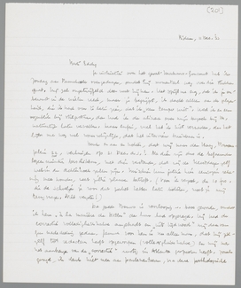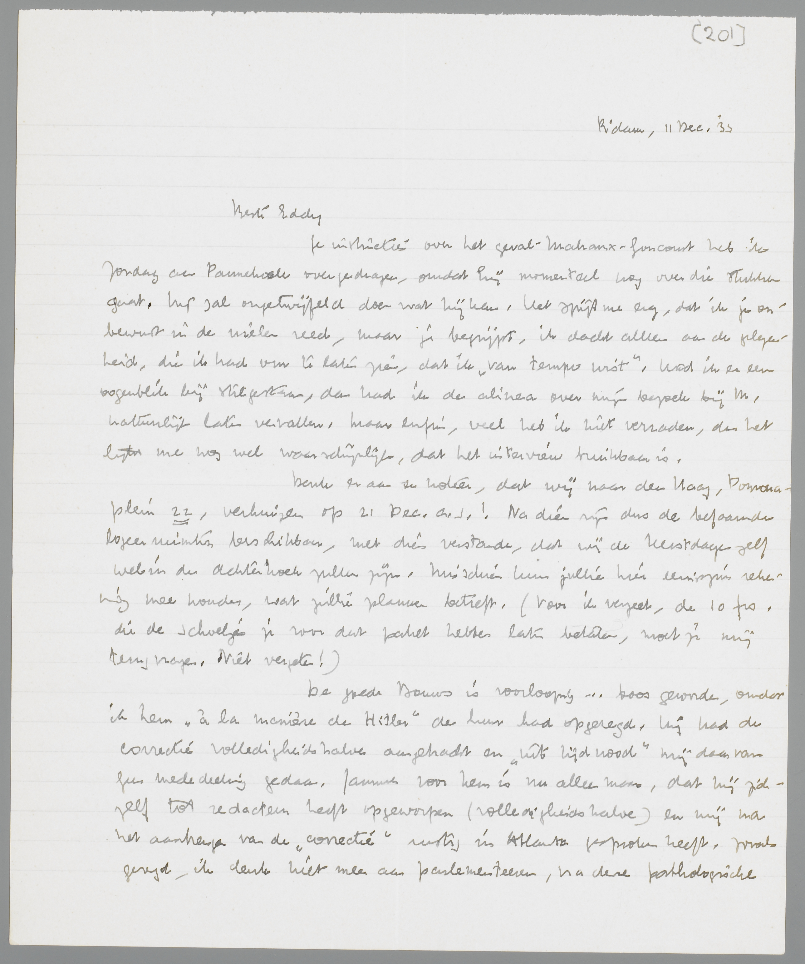De critiek van Anthonie op Dumay stuurde ik je, als een voorbeeld van zijn langzamerhand sterk gegroeide ‘verlogenheid’. Ik vind dit stuk zoo valsch (dat insinueeren over het flodderen aan de schrijfmachine, nu hij erkennen moet, dat ik toch een roman kan schrijven met levendige discoursen erin, en dat dan telkens weer behendig terugnemen), dat ik van plan ben hem hier op de plee achter te laten voor mijn opvolger. De ‘standing’ van de critiek zelf is niet zoo, dat ik erop in wensch te gaan. hart. gr. voor jullie beiden en van Ant