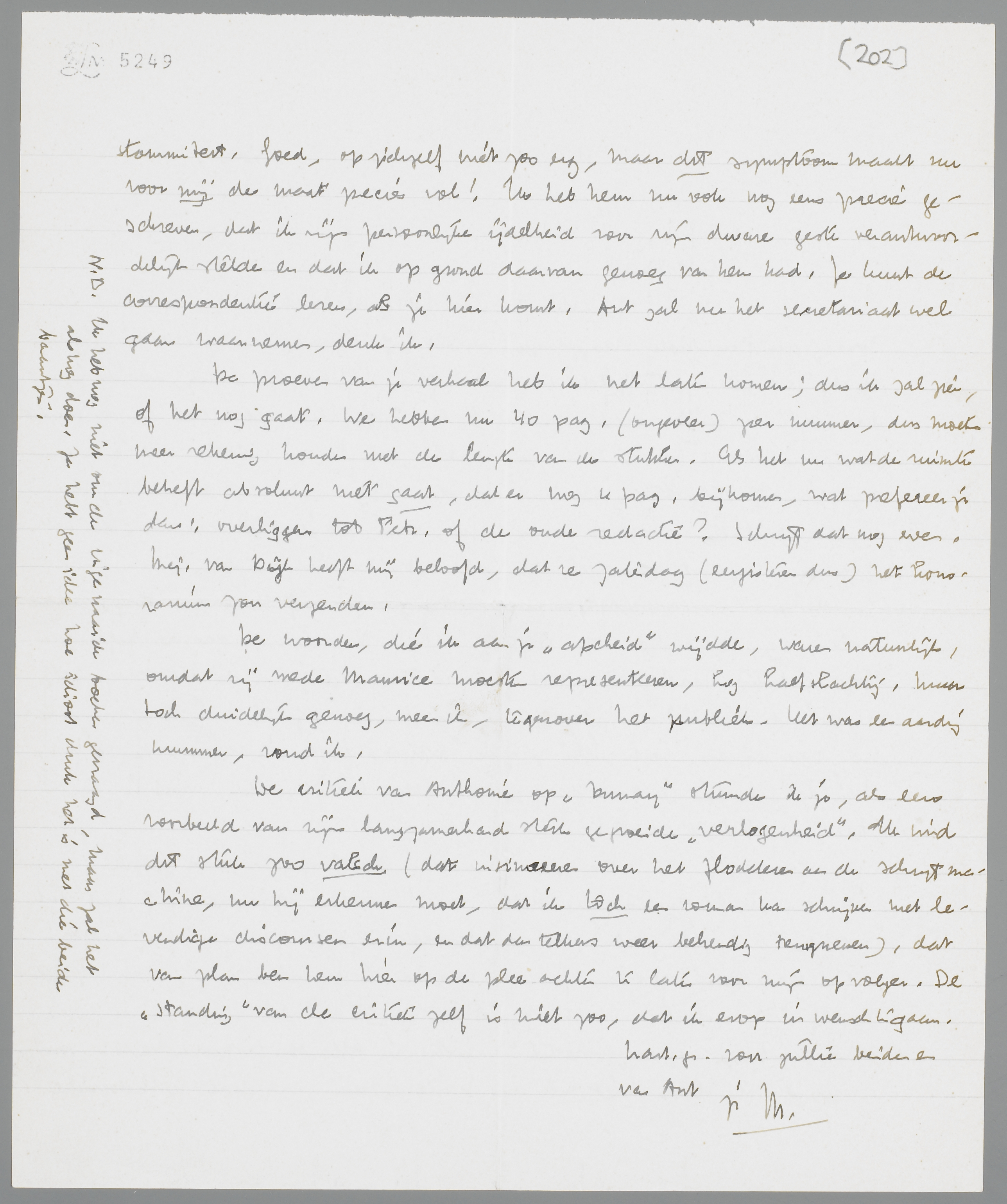De proeven van je verhaal heb ik net laten komen; dus ik zal zien, of het nog gaat. We hebben nu 40 pag. (ongeveer) per nummer, dus moeten meer rekening houden met de lengte van de stukken. Als het nu wat de ruimte betreft absoluut niet gaat, dat er nog 11 pag. bijkomen, wat prefereer je dan: overliggen tot Febr. of de oude redactie? Schrijf dat nog even. Mej. van Dijk heeft mij beloofd, dat ze Zaterdag (eergisteren dus) het honorarium zou verzenden.
