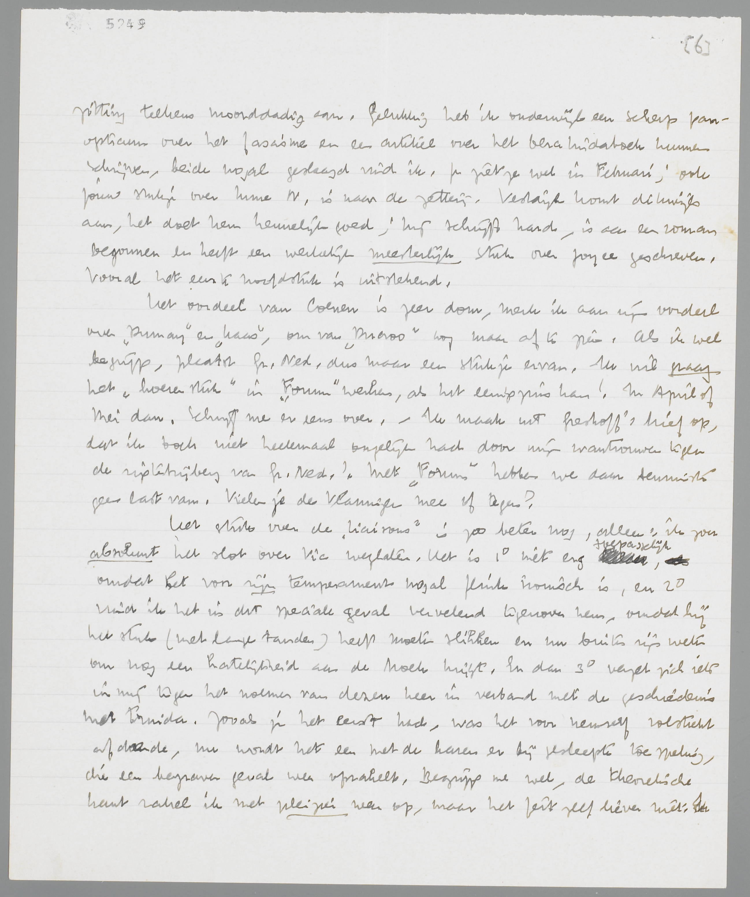 Het oordeel van Coenen is zeer dom, merk ik aan zijn oordeel over Dumay en Kaas, om van Ducroo nog maar af te zien. Als ik wel begrijp, plaatst Gr. Ned. dus maar een stukje ervan. Ik wil graag het ‘hoerenstuk’ in Forum werken, als het eenigszins kan! In April of Mei dan. Schrijf me er eens over. - Ik maak uit Greshoff's brief op, dat ik toch niet heelemaal ongelijk had door mijn wantrouwen tegen de rijstebrijberg van Gr. Ned.! Met Forum hebben we daar tenminste geen last van. Vielen je de Vlamingen mee of tegen?