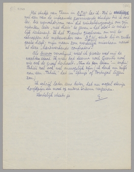 Het stukje van Theun in D.G.W. las ik. Het is wel een van de infaamste gearriveerde stukjes die ik ooit las. Die wenschdroom van dit winkelierszoontje om zijn vijanden later ‘niet thuis’ te geven - het slot - is werkelijk teekenend. Ik heb Kramers geschreven om mij te schrappen als medewerker van D.G.W., sinds hij er zulke goede heeft; mijn naam zou werkelijk misstaan naast al deze ‘hardwerkende confraters’!