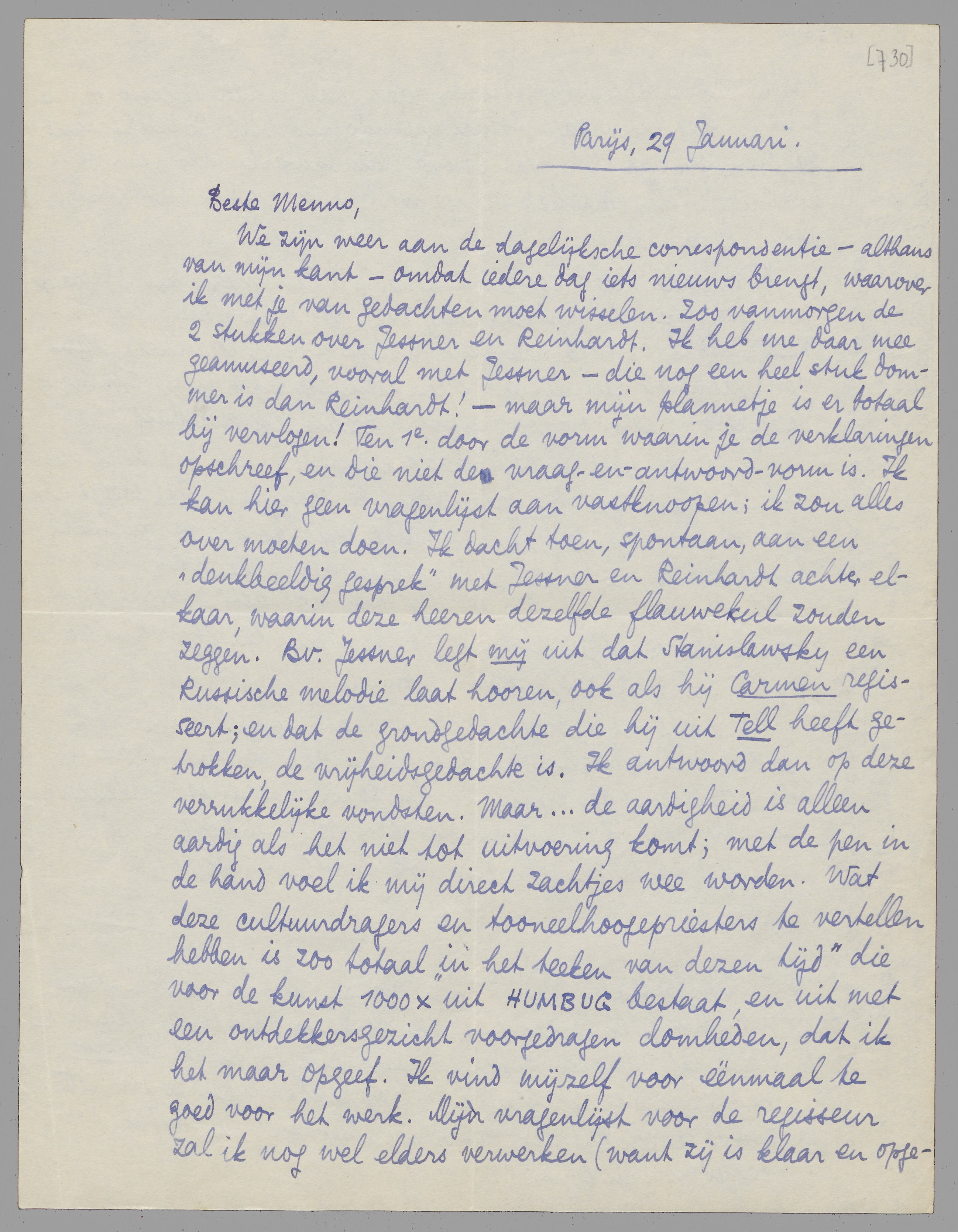 We zijn weer aan de dagelijksche correspondentie - althans van mijn kant - omdat iedere dag iets nieuws brengt, waarover ik met je van gedachten moet wisselen. Zoo vanmorgen de 2 stukken over Jessner en Reinhardt. Ik heb me daar mee geamuseerd, vooral met Jessner - die nog een heel stuk dommer is dan Reinhardt! - maar mijn plannetje is er totaal bij vervlogen! Ten 1e door de vorm waarin je de verklaringen opschreef, en die niet de vraag-en-antwoord-vorm is. Ik kan hier geen vragenlijst aan vastknoopen; ik zou alles over moeten doen. Ik dacht toen, spontaan, aan een ‘denkbeeldig gesprek’ met Jessner en Reinhardt achter elkaar, waarin deze heeren dezelfde flauwekul zouden zeggen. Bv. Jessner legt mij uit dat Stanislawsky een Russische melodie laat hooren, ook als hij Carmen regisseert; en dat de grondgedachte die hij uit Tell heeft getrokken, de vrijheidsgedachte is. Ik antwoord dan op deze verrukkelijke vondsten. Maar... de aardigheid is alleen aardig als het niet tot uitvoering komt; met de pen in de hand voel ik mij direct zachtjes wee worden. Wat deze cultuurdragers en toneelhoogepriesters te vertellen hebben is zoo totaal ‘in het teeken van dezen tijd’ die voor de kunst 1000 × uit HUMBUG bestaat, en uit met een ontdekkersgezicht voorgedragen domheden, dat ik het maar opgeef. Ik vind mijzelf voor éénmaal te goed voor het werk. Mijn vragenlijst voor de regisseur zal ik nog wel elders verwerken (want zij is klaar en opgeteekend). Deze twee professoren gaan dan maar ongestoord hun gang in het land van Israël Querido en Dirk Coster - tout va bien, en dat Cor met Jessner samenwerkt als ‘een meer afzijdige’ Tell, was het eenige wat er nog aan ontbrak voor ‘le mieux’.