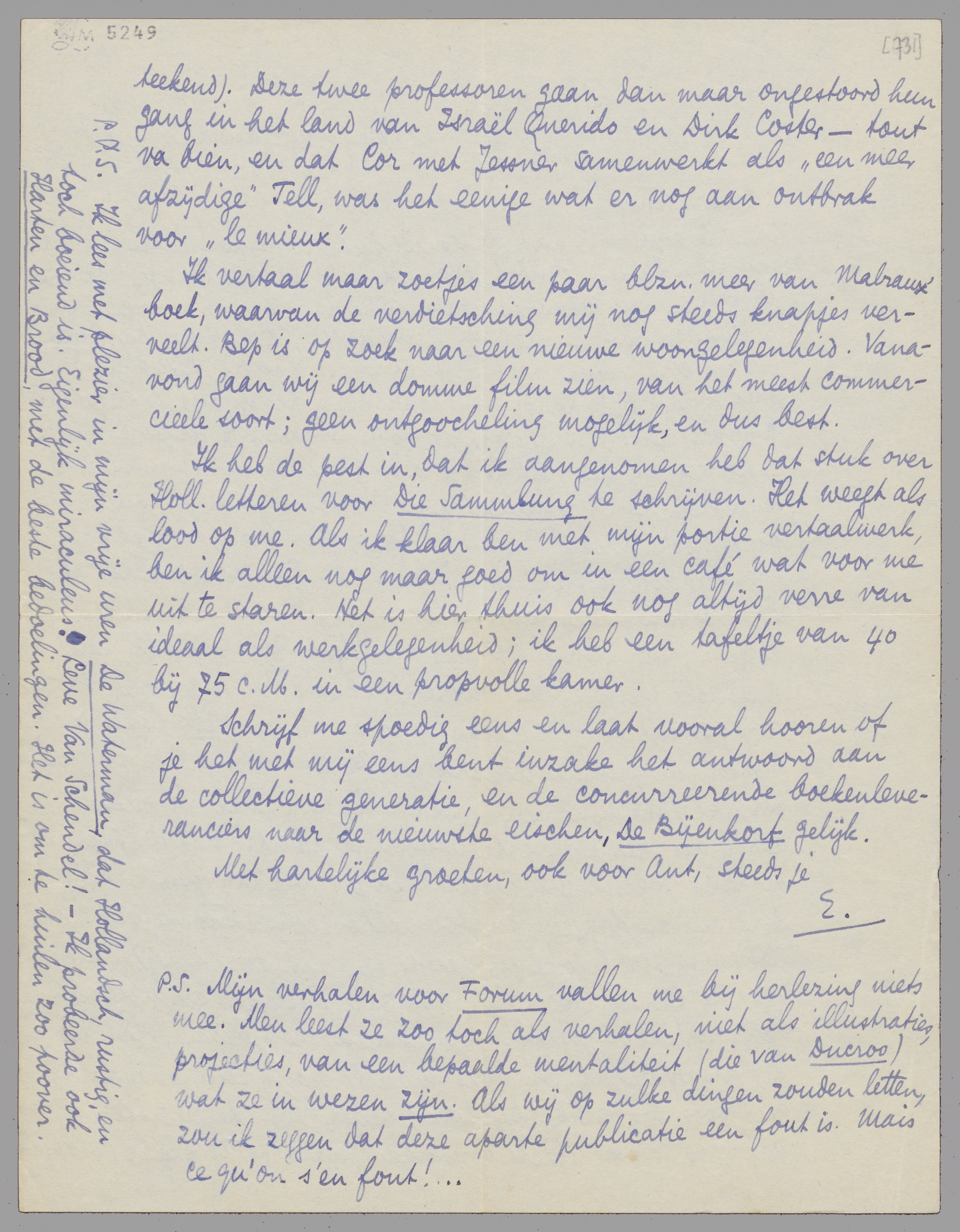 Ik heb de pest in, dat ik aangenomen heb dat stuk over Holl. letteren voor Die Sammlung te schrijven. Het weegt als lood op me. Als ik klaar ben met mijn portie vertaalwerk, ben ik alleen nog maar goed om in een café wat voor me uit te staren. Het is hier thuis ook nog altijd verre van ideaal als werkgelegenheid; ik heb een tafeltje van 40 bij 75 c.M. in een propvolle kamer. Schrijf me spoedig eens en laat vooral hooren of je het met mij eens bent inzake het antwoord aan de collectieve generatie, en de concurreerende boekenleveranciers naar de nieuwste eischen, De Bijenkorf gelijk.