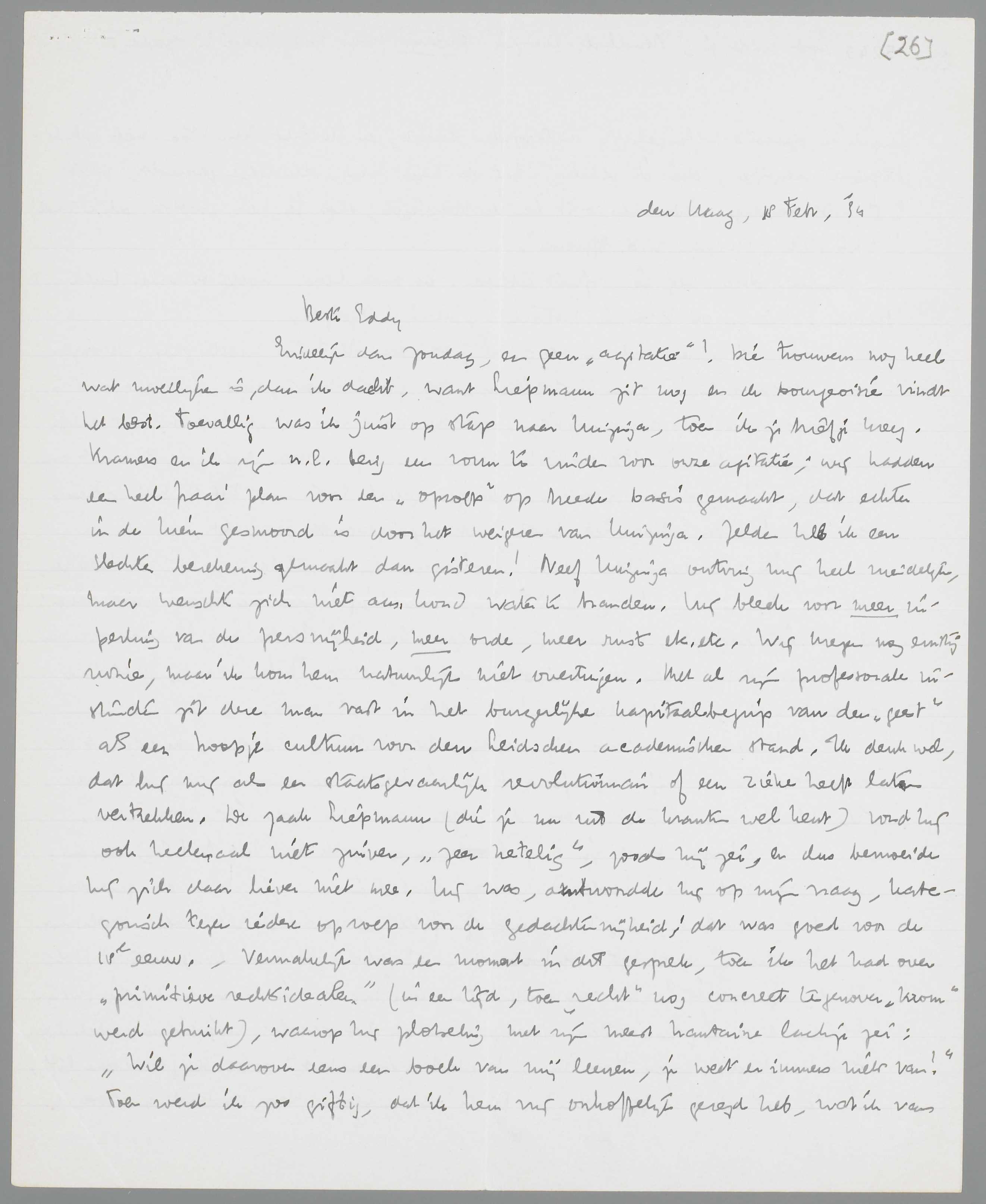 Eindelijk dan Zondag, en geen ‘agitatie’! Die trouwens nog heel wat moeilijker is, dan ik dacht, want Liepmann zit nog en de bourgeoisie vindt het best. Toevallig was ik juist op stap naar Huizinga, toen ik je briefje kreeg. Kramers en ik zijn n.l. bezig een vorm te vinden voor onze agitatie; wij hadden een heel fraai plan voor een ‘oproep’ op breede basis gemaakt, dat echter in de kiem gesmoord is door het weigeren van Huizinga. Zelden heb ik een slechter berekening gemaakt dan gisteren! Neef Huizinga ontving mij heel vriendelijk, maar wenschte zich niet aan koud water te branden. Hij bleek voor meer inperking van de persvrijheid, meer orde, meer rust etc. etc. Wij kregen nog ernstig ruzie, maar ik kon hem natuurlijk niet overtuigen. Met al zijn professorale instincten zit deze man vast in het burgerlijke kapitaalbegrip van den ‘geest’ als een hoopje cultuur voor den Leidschen academischen stand. Ik denk wel, dat hij mij als een staatsgevaarlijk revolutionnair of een zieke heeft laten vertrekken. De zaak Liepmann (die je nu uit de kranten wel kent) vond hij ook heelemaal niet zuiver, ‘zeer netelig’, zooals hij zei, en dus bemoeide hij zich daar liever niet mee. Hij was, antwoordde hij op mijn vraag, kategorisch tegen iedere oproep voor de gedachtenvrijheid; dat was goed voor de 18e eeuw. - Vermakelijk was een moment in dit gesprek, toen ik het had over ‘primitieve rechtsidealen’ (in een tijd, toen ‘recht’ nog concreet tegenover ‘krom’ werd gebruikt), waarop hij plotseling met zijn meest hautaine lachje zei: ‘Wil je daarover eens een boek van mij leenen, je weet er immers niets van!’ Toen werd ik zoo giftig, dat ik hem vrij onhoffelijk gezegd heb, wat ik van dergelijke quasi-welingelichte antwoorden dacht, en ik heb hem toen met philologische bewijzen, die ik gelukkig bij de hand had, duidelijk gemaakt, wat hij niet begreep. Meer dan ooit ben ik overtuigd, dat ik het grootste gelijk had in mijn stuk Huizinga v.d. Afgrond.