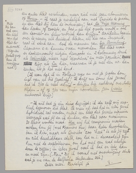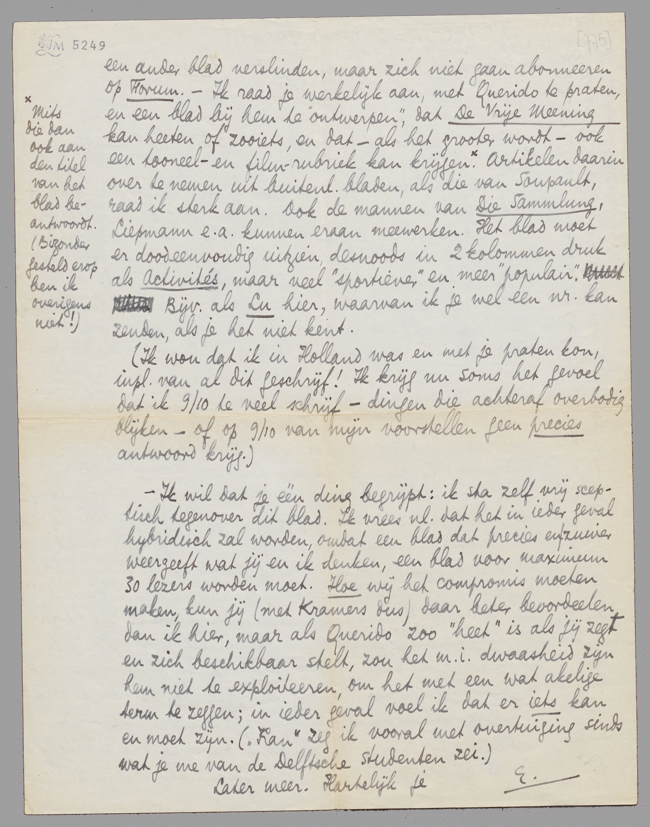 - Ik wil dat je één ding begrijpt: ik sta zelf vrij sceptisch tegenover dit blad. Ik vrees nl. dat het in ieder geval hybridisch zal worden, omdat een blad dat precies en zuiver weergeeft wat jij en ik denken, een blad voor maximum 30 lezers worden moet. Hoe wij het compromis moeten maken, kun jij (met Kramers dus) daar beter beoordeelen dan ik hier, maar als Querido zoo ‘heet’ is als jij zegt en zich beschikbaar stelt, zou het m.i. dwaasheid zijn hem niet te exploiteeren, om het met een wat akelige term te zeggen; in ieder geval voel ik dat er iets kan en moet zijn. (‘Kan’ zeg ik vooral met overtuiging sinds wat je me van de Delftsche studenten zei.)