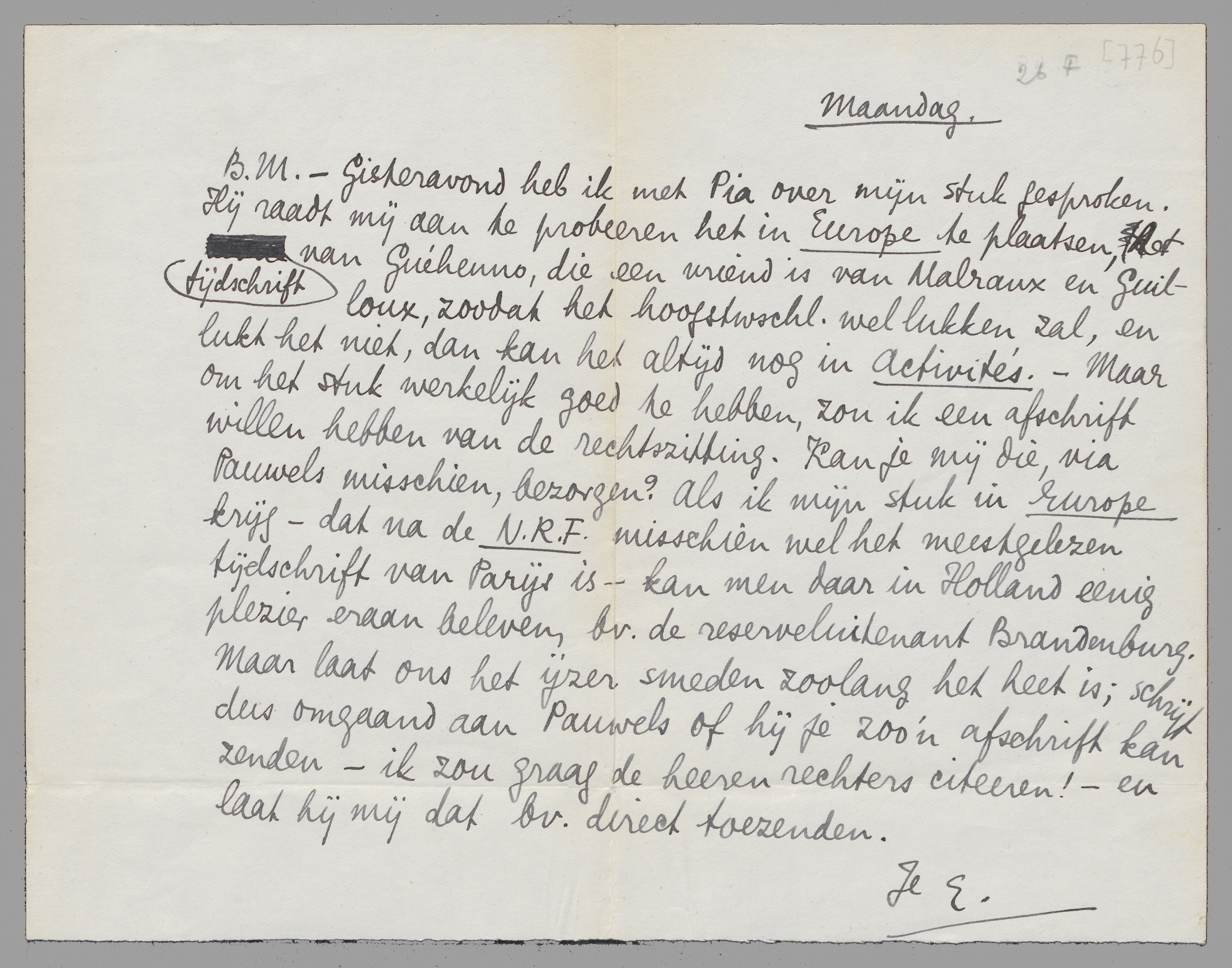 - Gisteravond heb ik met Pia over mijn stuk gesproken. Hij raadt mij aan te probeeren het in Europe te plaatsen, het tijdschrift van Guéhenno, die een vriend is van Malraux en Guilloux, zoodat het hoogstwschl. wel lukken zal, en lukt het niet, dan kan het altijd nog in Activités. - Maar om het stuk werkelijk goed te hebben, zou ik een afschrift willen hebben van de rechtszitting. Kan je mij die, via Pauwels misschien, bezorgen? Als ik mijn stuk in Europe krijg - dat na de N.R.F. misschien wel het meestgelezen tijdschrift van Parijs is - kan men daar in Holland eenig plezier eraan beleven, bv. de reserveluitenant Brandenburg. Maar laat ons het ijzer smeden zoolang het heet is; schrijf dus omgaand aan Pauwels of hij je zoo'n afschrift kan zenden - ik zou graag de heeren rechters citeeren! - en laat hij mij dat bv. direct toezenden.