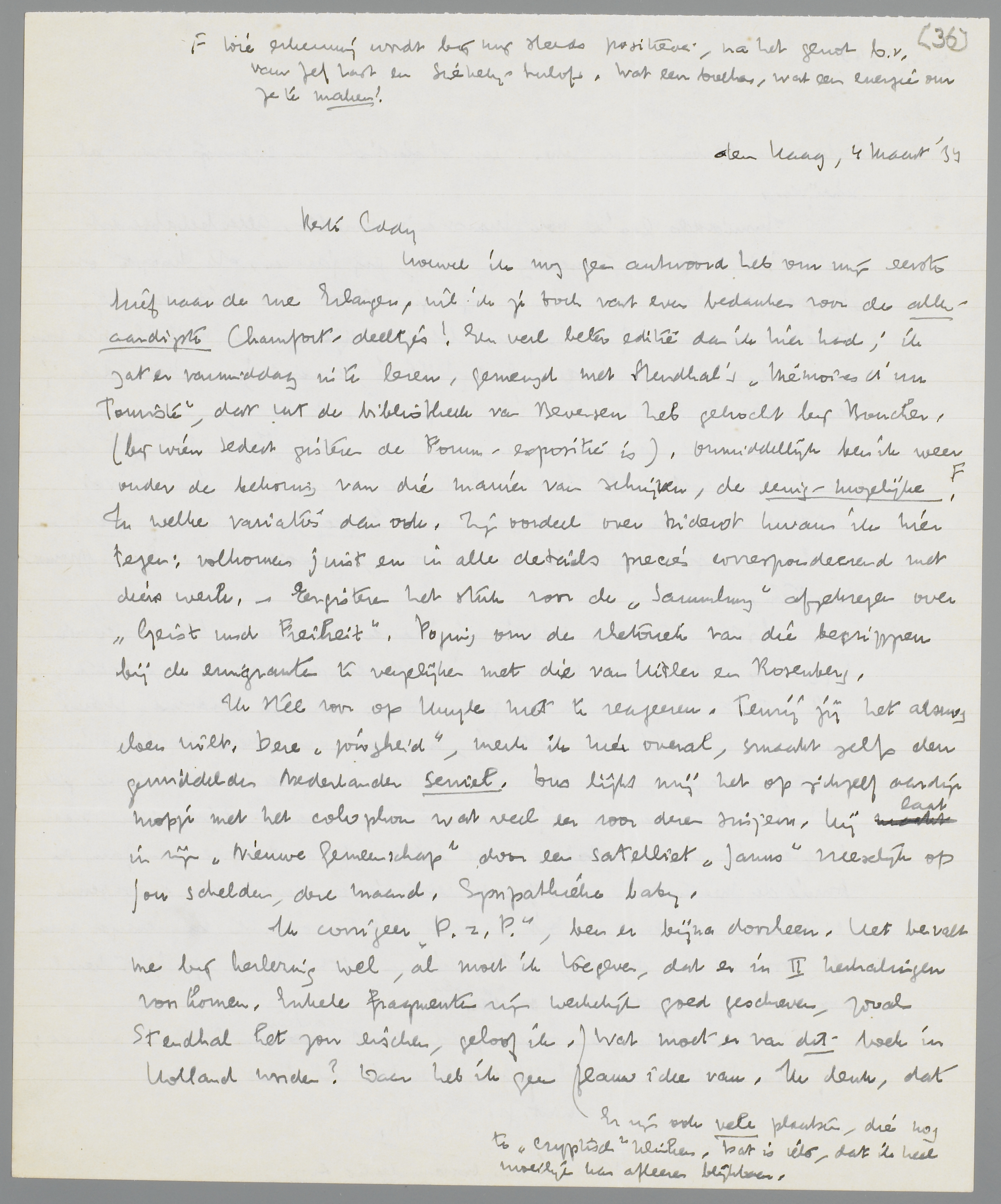 Hoewel ik nog geen antwoord heb om mijn eerste brief naar de rue Erlanger, wil ik je toch vast even bedanken voor de alleraardigste Chamfort-deeltjes! Een veel beter editie dan ik hier had; ik zat er vanmiddag in te lezen, gemengd met Stendhal's Mémoires d'un Touriste, dat uit de bibliotheek van Beversen heb gekocht bij Boucher. (bij wien sedert gisteren de Forum-expositie is). Onmiddellijk ben ik weer onder de bekoring van die manier van schrijven, de eenig-mogelijke. [Die erkenning wordt bij mij steeds positiever, na het genot b.v. van Jef Last en Szekely-Lulofs. Wat een boeken, wat een energie om ze te maken!] In welke variaties dan ook. Zijn oordeel over Diderot kwam ik hier tegen: volkomen juist en in alle details precies correspondeerend met diens werk. - Eergisteren het stuk voor de Sammlung afgekregen over Geist und Freiheit. Poging om de rhetoriek van die begrippen bij de emigranten te vergelijken met die van Hitler en Rosenberg.