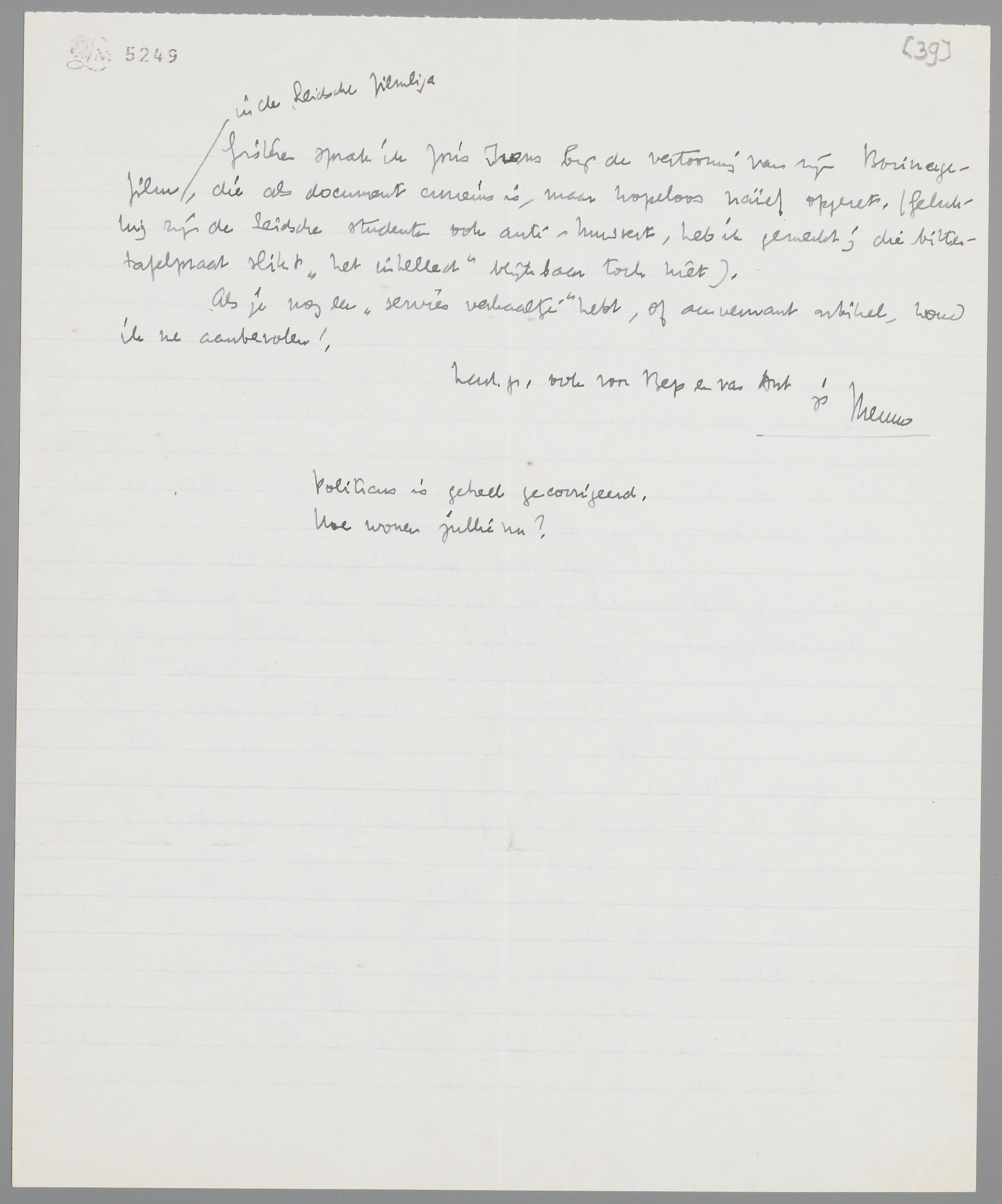 Benieuwd hoe lang je aan den briefkaartvorm zult vasthouden! Ik krijg in ieder geval liever briefkaarten dan niets. Ik zou je vooreerst willen vragen, of je niet voor April het beloofde artikeltje over Mussolini kunt schrijven. Vestdijk's Joyce II moet n.l. in dat nummer en om nu niet te veel essay te kweeken, zou ik de Liaisons in Mei willen plaatsen. Stuur me het stukje over Muss. dan zoo mogelijk voor 15 Maart.