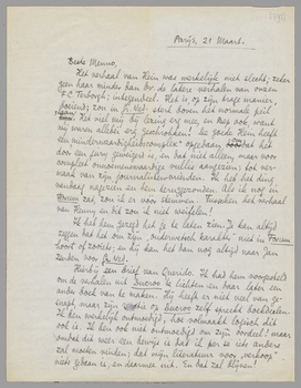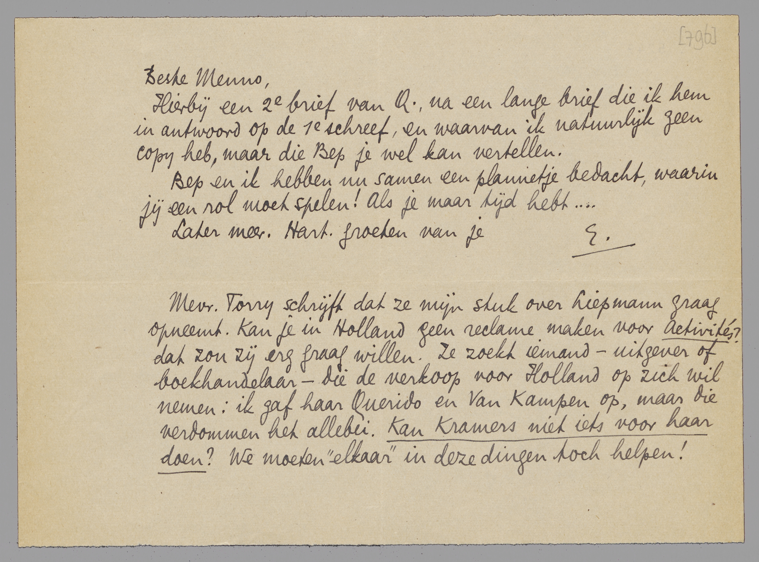 Mevr. Torry schrijft dat ze mijn stuk over Liepmann graag opneemt. Kan je in Holland geen reclame maken voor Activités? dat zou zij erg graag willen. Ze zoekt iemand - uitgever of boekhandelaar - die de verkoop voor Holland op zich wil nemen: ik gaf haar Querido en Van Kampen op, maar die verdommen het allebei. Kan Kramers niet iets voor haar doen? We moeten ‘elkaar’ in deze dingen toch helpen!