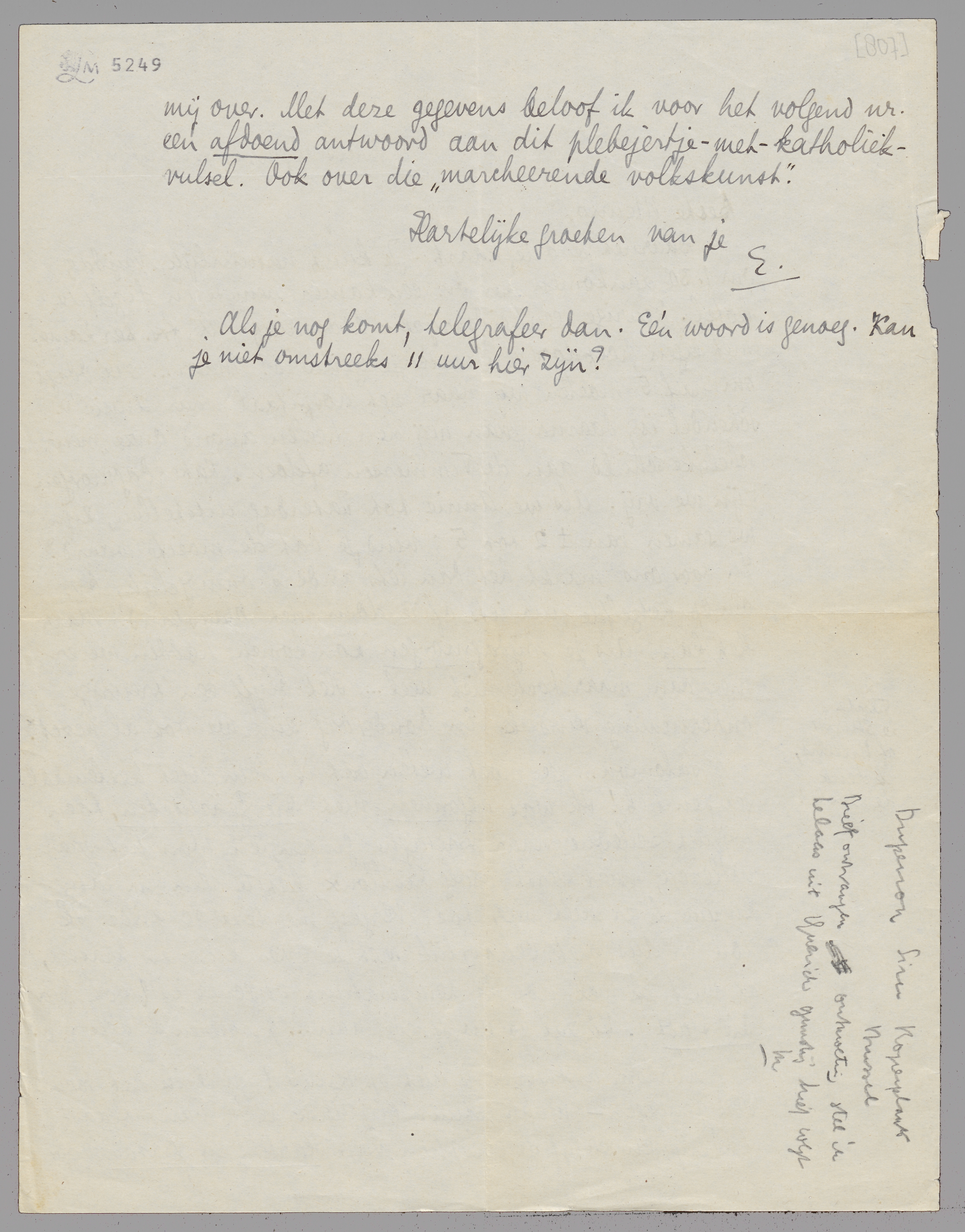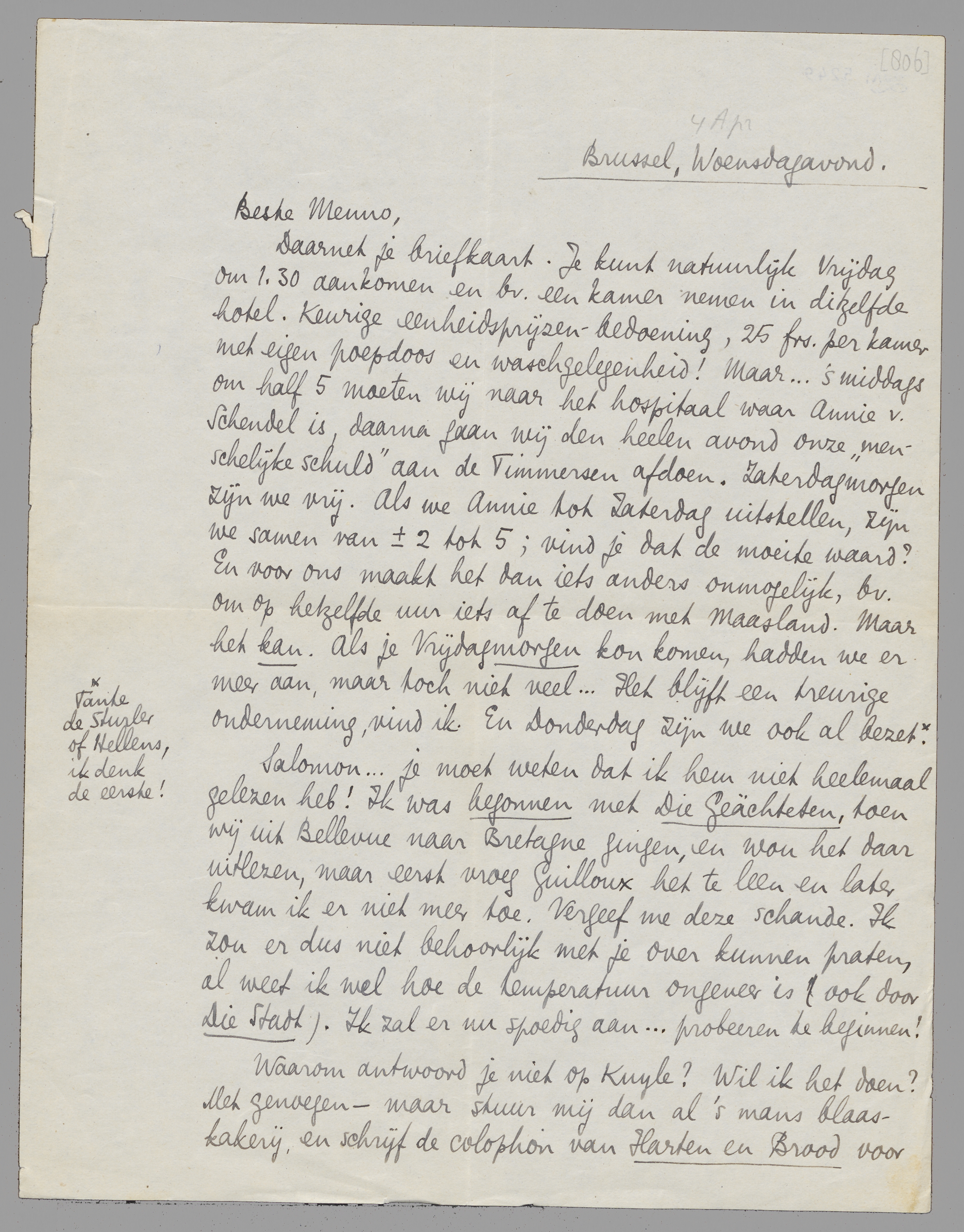 Daarnet je briefkaart. Je kunt natuurlijk Vrijdag om 1.30 aankomen en bv. een kamer nemen in ditzelfde hotel. Keurige eenheidsprijzen-bedoening, 25 frs. per kamer met eigen poepdoos en waschgelegenheid! Maar... 's middags om half 5 moeten wij naar het hospitaal waar Annie v. Schendel is, daarna gaan wij den heelen avond onze ‘menschelijke schuld’ aan de Timmersen afdoen. Zaterdagmorgen zijn we vrij. Als we Annie tot Zaterdag uitstellen, zijn we samen van ± 2 tot 5; vind je dat de moeite waard? En voor ons maakt het dan iets anders onmogelijk, bv. om op hetzelfde uur iets af te doen met Maasland. Maar het kan. Als je Vrijdagmorgen kon komen, hadden we er meer aan, maar toch niet veel... Het blijft een treurige onderneming, vind ik. En Donderdag zijn we ook al bezet. [Tante de Sturler of Hellens, ik denk de eerste!]