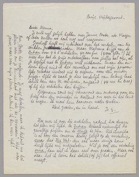 Greshoff heeft mij inderdaad over het vertalen van die stukken gesproken. Maar Malraux krijgt van de Intran voor 4 à 6 artikelen 40.000 frs. (4000 gldn!) Ik vrees dus dat de prijs onbetaalbaar voor jullie zal zijn, als je tegelijk met de Intran wilt uitkomen. En aan den anderen kant vind ik het vervelend om met mijn persoonlijke relaties invloed uit te oefenen voor een minder prijsje. Lijkt de zaak je dus werkelijk van belang, laat Schilt dan aan M. schrijven, omgaand (44 rue du Bac) of hij die artikelen kan krijgen.
