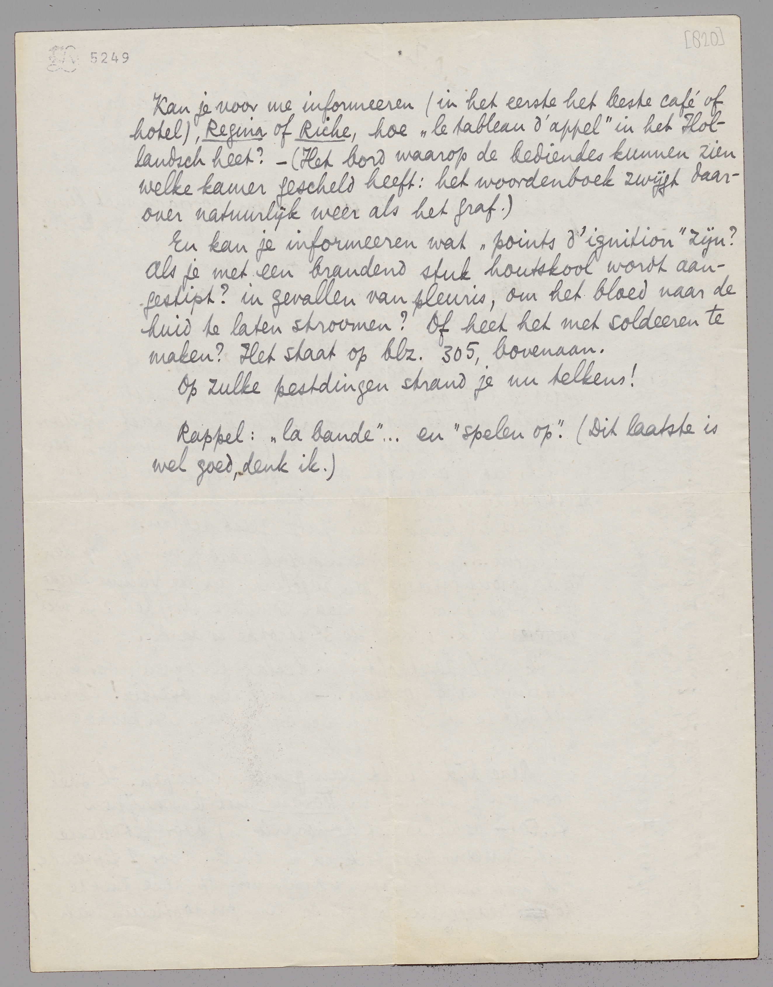 Kan je voor me informeeren (in het eerste het beste café of hotel), Regina of Riche, hoe ‘le tableau d'appel’ in het Hollandsch heet? - (Het bord waarop de bediendes kunnen zien welke kamer gescheld heeft: het woordenboek zwijgt daarover natuurlijk weer als het graf.)