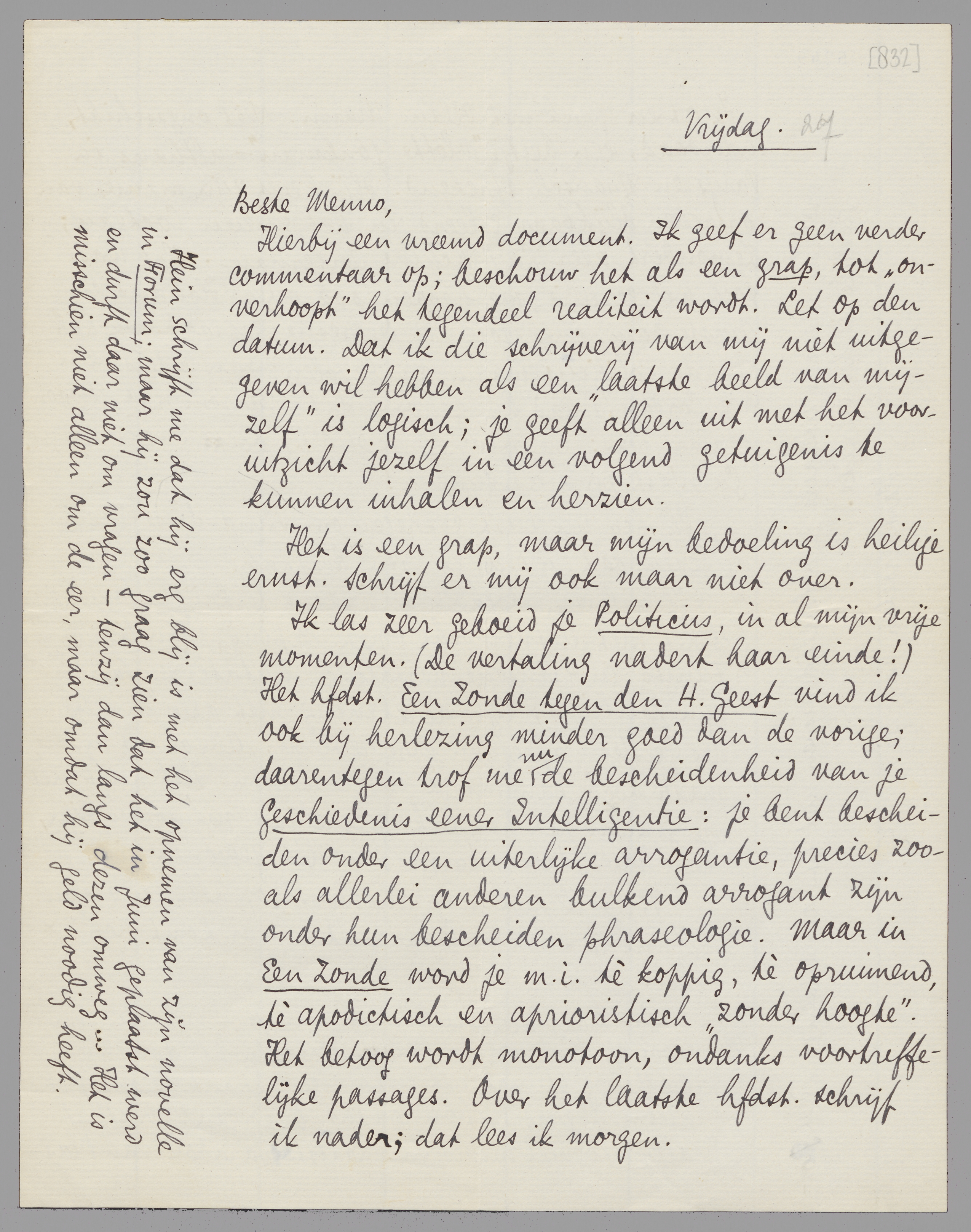 Ik las zeer geboeid je Politicus, in al mijn vrije momenten. (De vertaling nadert haar einde!) Het hfdst. Een Zonde tegen den H. Geest vind ik ook bij herlezing minder goed dan de vorige; daarentegen trof me nu de bescheidenheid van je Geschiedenis eener Intelligentie: je bent bescheiden onder een uiterlijke arrogantie, precies zooals allerlei anderen bulkend arrogant zijn onder hun bescheiden phraseologie. Maar in Een Zonde word je m.i. tè koppig, tè opruimend, tè apodictisch en aprioristisch ‘zonder hoogte’. Het betoog wordt monotoon, ondanks voortreffelijke passages. Over het laatste hfdst. schrijf ik nader; dat lees ik morgen.