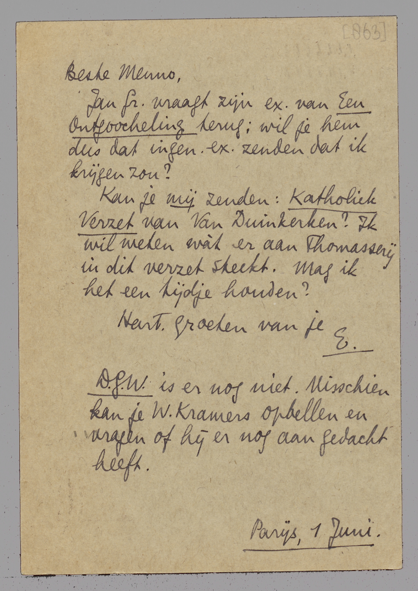Kan je mij zenden: Katholiek Verzet van Van Duinkerken? Ik wil weten wàt er aan Thomasserij in dit verzet steekt. Mag ik het een tijdje houden? Hart. groeten van je