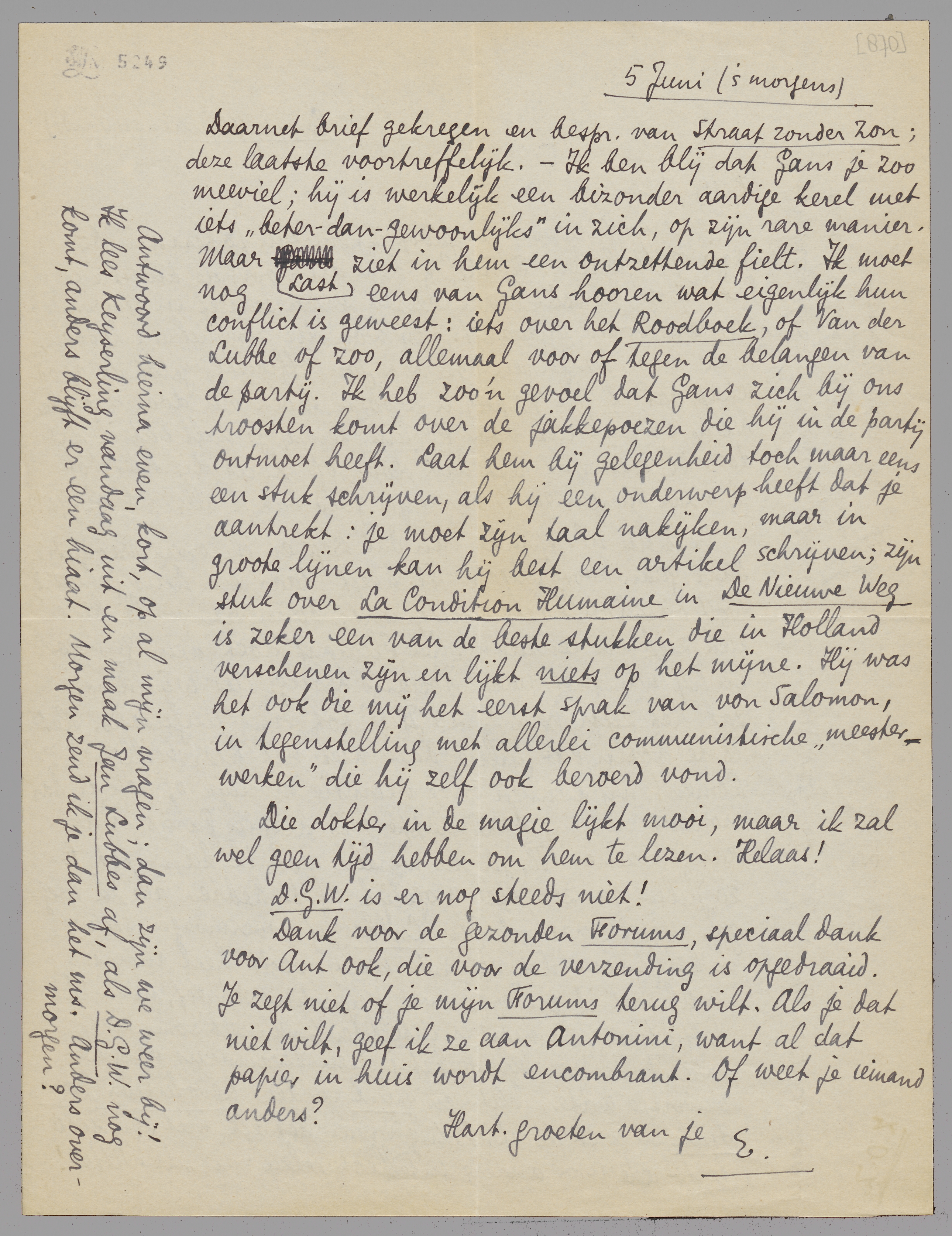 Daarnet brief gekregen en bespr. van Straat zonder Zon; deze laatste voortreffelijk. - Ik ben blij dat Gans je zoo meeviel; hij is werkelijk een bizonder aardige kerel met iets ‘beter-dan-gewoonlijks’ in zich, op zijn rare manier. Maar Last ziet in hem een ontzettende fielt. Ik moet nog eens van Gans hooren wat eigenlijk hun conflict is geweest: iets over het Roodboek, of Van der Lubbe of zoo, allemaal voor of tegen de belangen van de partij. Ik heb zoo'n gevoel dat Gans zich bij ons troosten komt over de jakkepoezen die hij in de partij ontmoet heeft. Laat hem bij gelegenheid toch maar eens een stuk schrijven, als hij een onderwerp heeft dat je aantrekt: je moet zijn taal nakijken, maar in groote lijnen kan hij best een artikel schrijven; zijn stuk over La Condition Humaine in De Nieuwe Weg is zeker een van de beste stukken die in Holland verschenen zijn en lijkt niets op het mijne. Hij was het ook die mij het eerst sprak van von Salomon, in tegenstelling met allerlei communistische ‘meesterwerken’ die hij zelf ook beroerd vond.