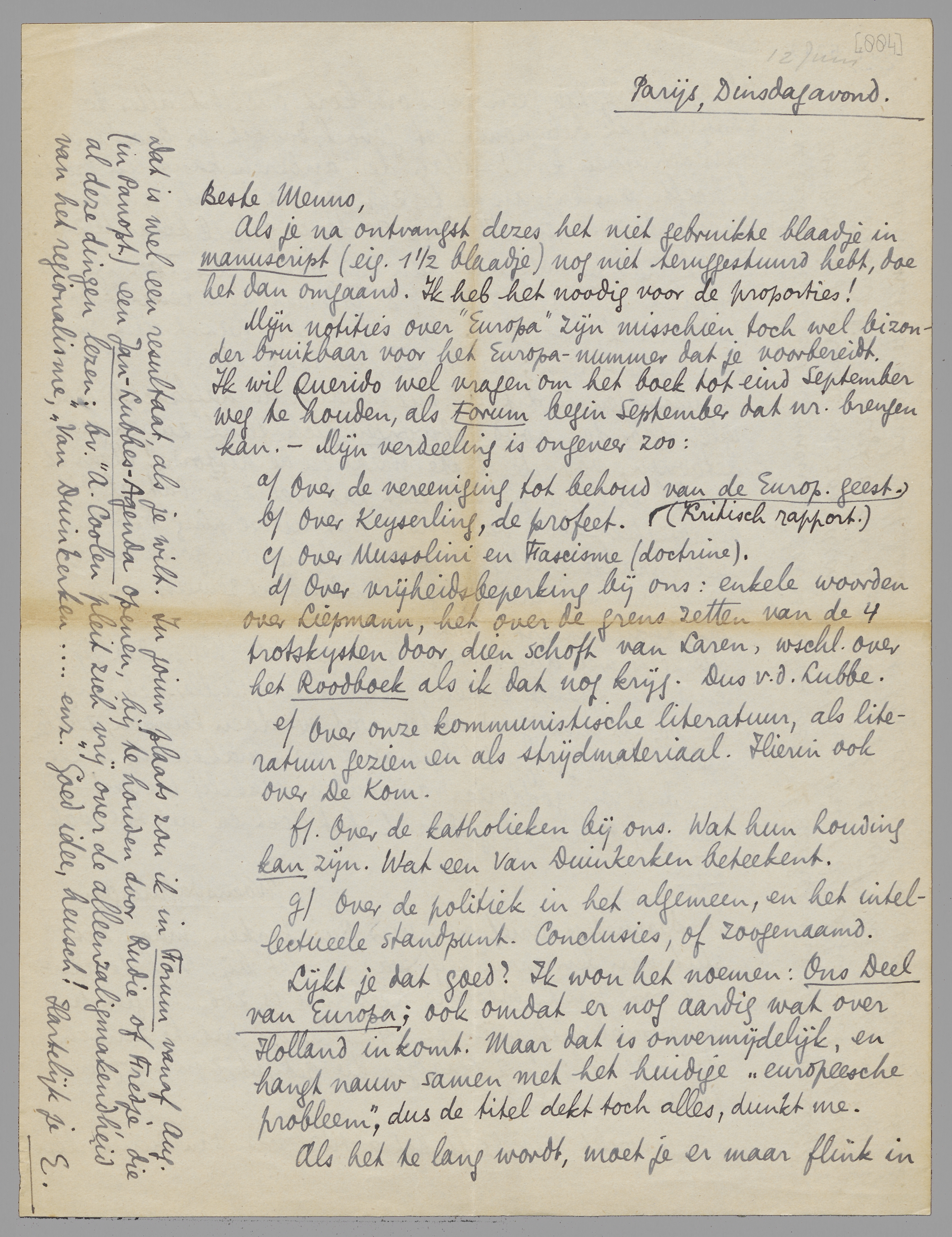 Mijn notities over ‘Europa’ zijn misschien toch wel bizonder bruikbaar voor het Europa-nummer dat je voorbereidt. Ik wil Querido wel vragen om het boek tot eind September weg te houden, als Forum begin September dat nr. brengen kan. - Mijn verdeeling is ongeveer zoo: