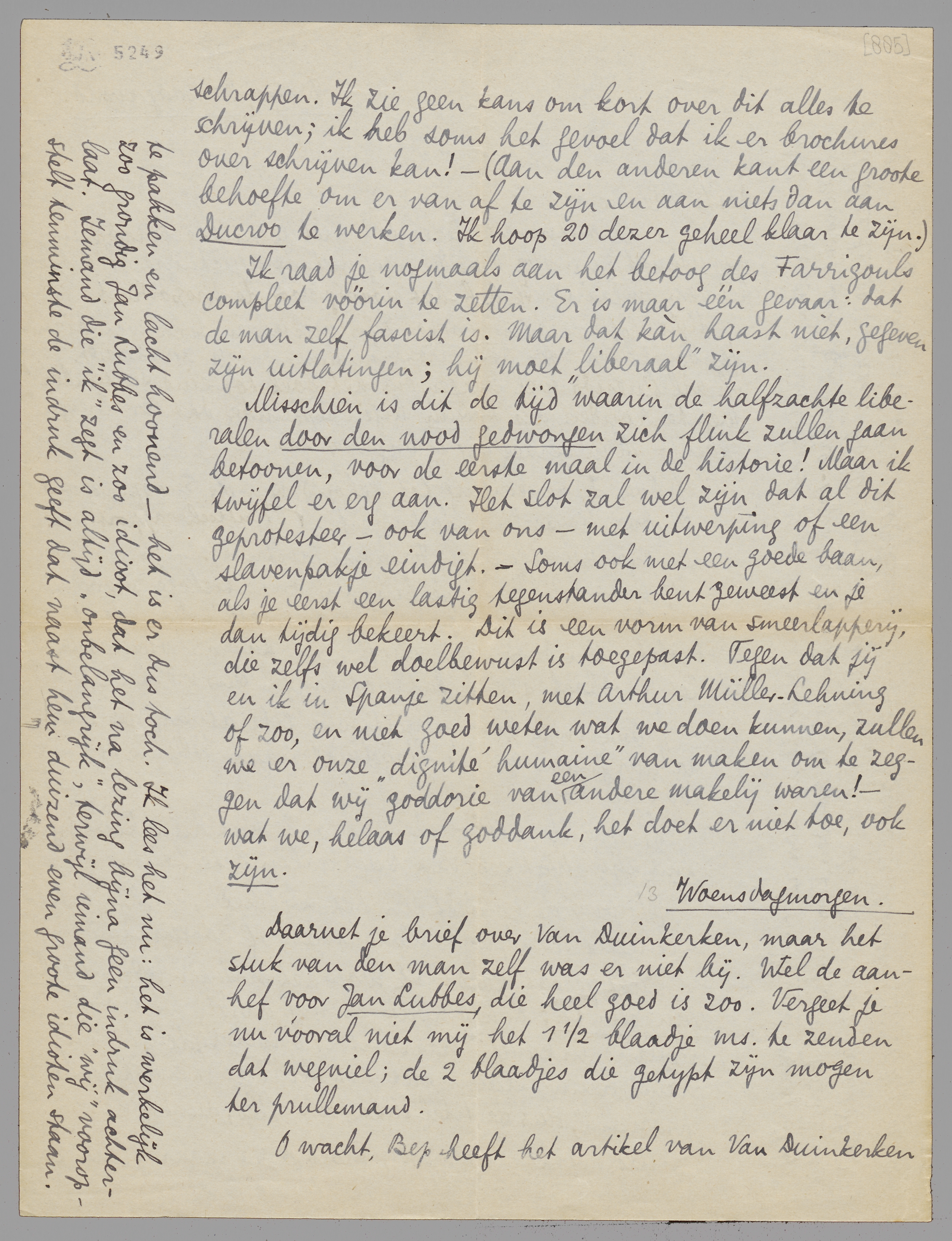 Daarnet je brief over Van Duinkerken, maar het stuk van den man zelf was er niet bij. Wel de aanhef voor Jan Lubbes, die heel goed is zoo. Vergeet je nu vooral niet mij het 1½ blaadje ms. te zenden dat wegviel; de 2 blaadjes die getypt zijn mogen ter prullemand.