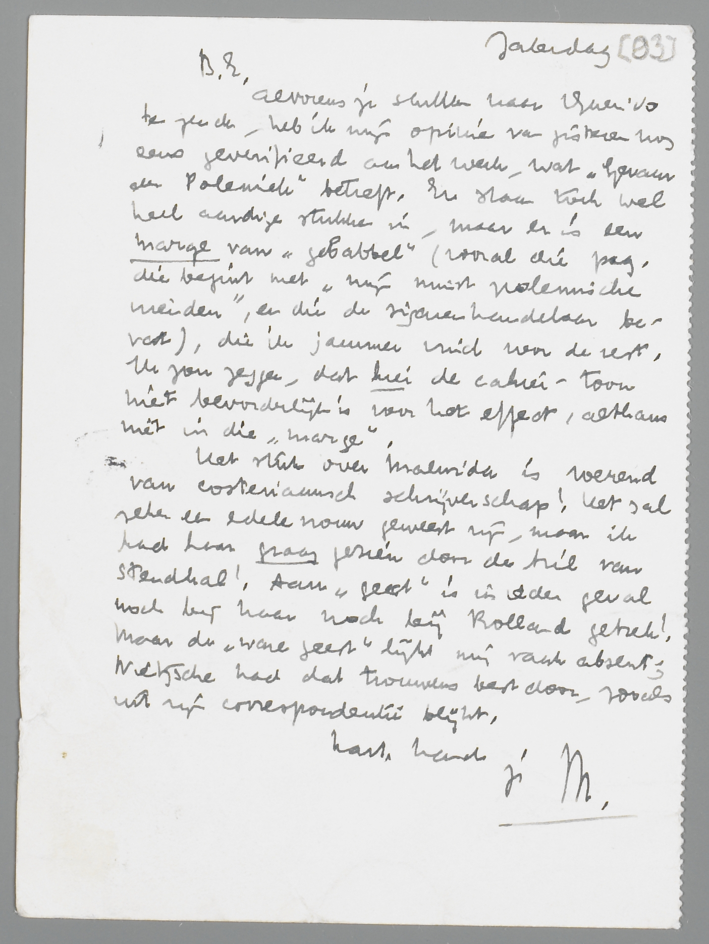 Het stuk over Malwida is roerend van costeriaansch schrijverschap! Het zal zeker een edele vrouw geweest zijn, maar ik had haar graag gezien door de bril van Stendhal! Aan ‘geest’ is in ieder geval noch bij haar noch bij Rolland gebrek! Maar de ‘ware geest’ lijkt mij vaak absent; Nietzsche had dat trouwens best door, zooals uit zijn correspondentie blijkt. hart. hand je