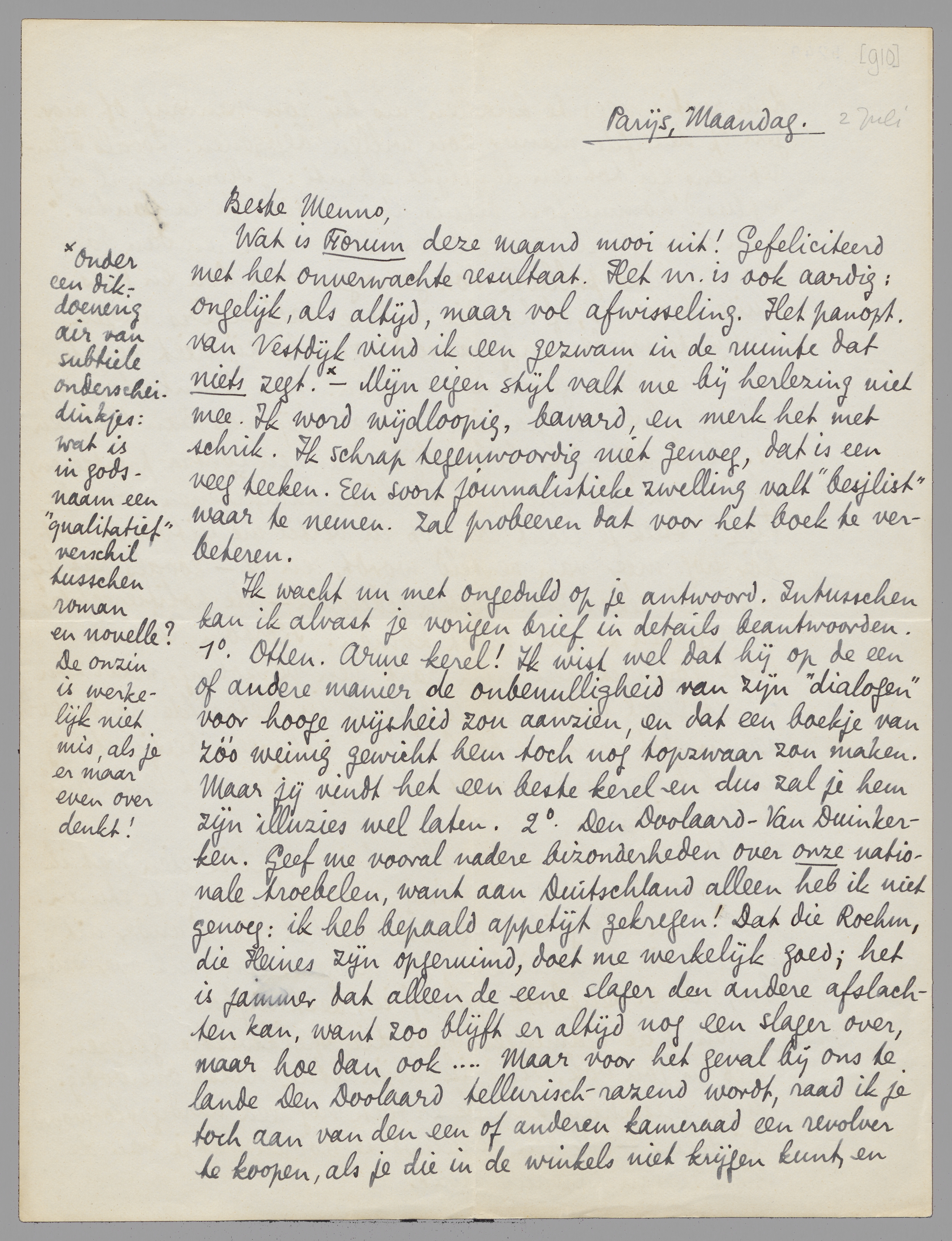 Ik zal Querido nu schrijven om mij die stukken terug te sturen en zal zien wat ik schrappen kan. Maak jij van jouw kant uit wat je in Forum plaatst, alles of een fragment. Schrijf mij dat zoo spoedig mogelijk en laat dan gauw overtikken wat je voor Forum neemt; gerust door een ‘juffrouw’ als Ant niet kan.