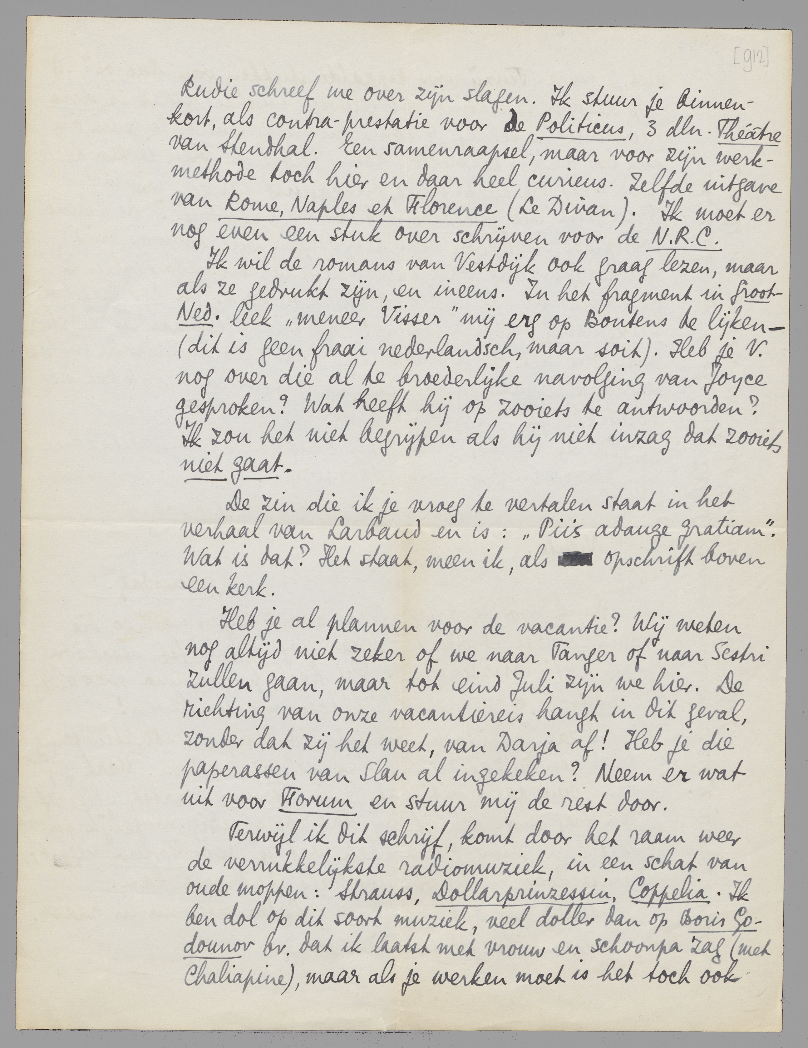Ik wil de romans van Vestdijk ook graag lezen, maar als ze gedrukt zijn, en ineens. In het fragment in Groot-Ned. leek ‘meneer Visser’ mij erg op Boutens te lijken - (dit is geen fraai nederlandsch, maar soit). Heb je V. nog over die al te broederlijke navolging van Joyce gesproken? Wat heeft hij op zooiets te antwoorden? Ik zou het niet begrijpen als hij niet inzag dat zooiets niet gaat.