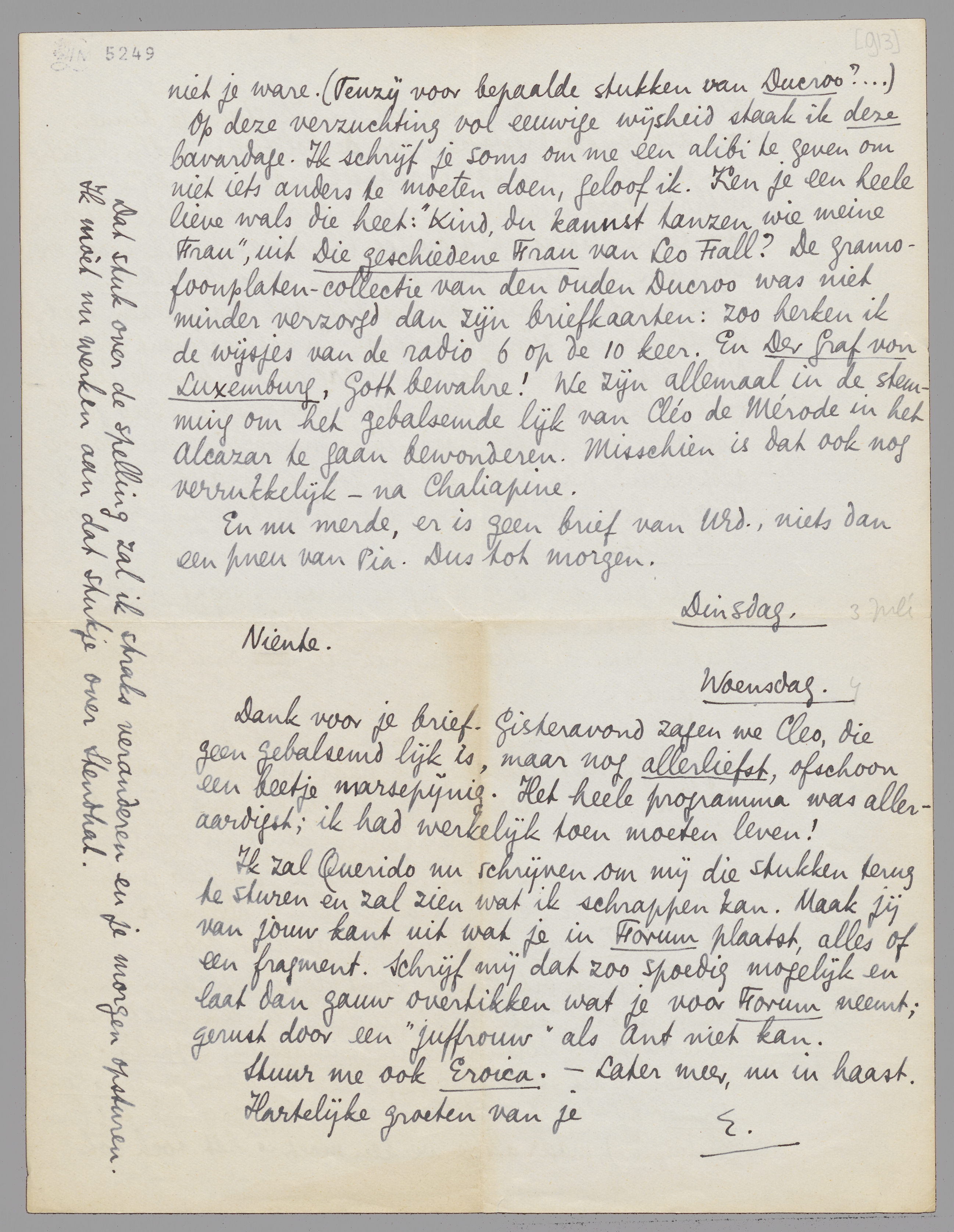 Dank voor je brief. Gisteravond zagen we Cleo, die geen gebalsemd lijk is, maar nog allerliefst, ofschoon een beetje marsepijnig. Het heele programma was alleraardigst; ik had werkelijk toen moeten leven!