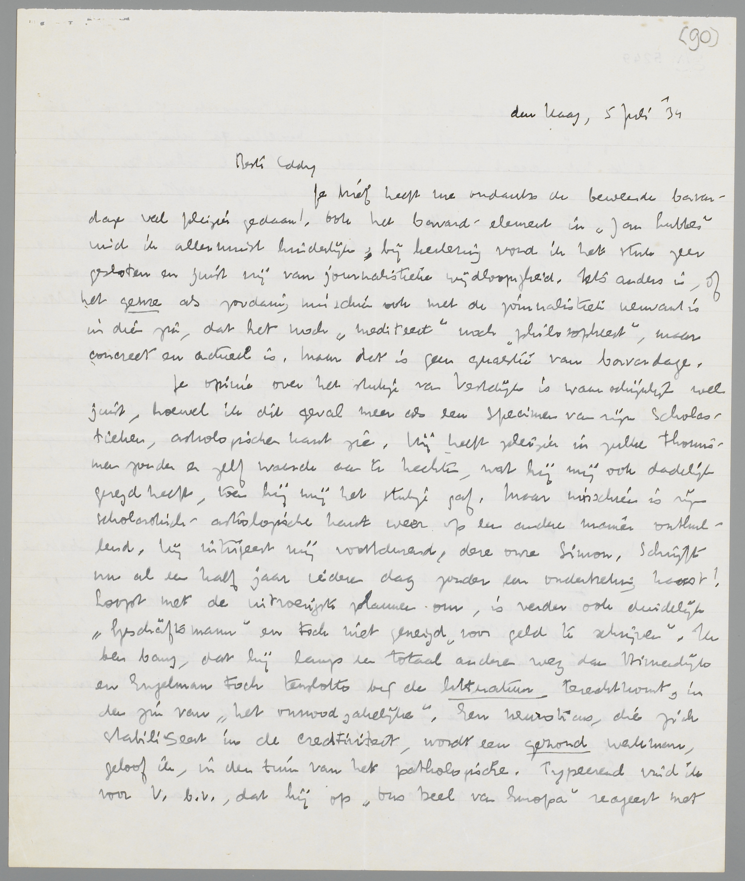Over het geval v. Duinkerken geen nader nieuws. Het is mogelijk, dat ik na mijn stuk over de eeuwige jeugd in Het Vad. [ik liet het je zenden] ook ‘geslagen’ word; generaal Schleicher zal er niets bij zijn. Het gezegde van dien Fleuret is overigens onbetaalbaar! En een zeer preciese limiteering van de spierproletige kracht! Overigens blijkt (lees daarover deze week Schwarzschild vooral in Das Neue Tagebuch, dat is werkelijk kraakhelder geschreven!) de moordpartij op Roehm c.s. weer een Rijksdagbrand-affaire te worden! Met een even dom-sluwe enscèneering, naar het schijnt en naar Schwarzschild heel humoristisch bewijst.