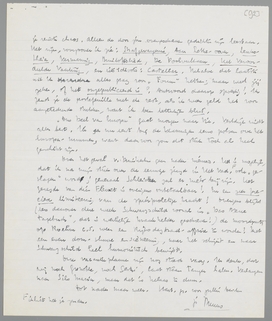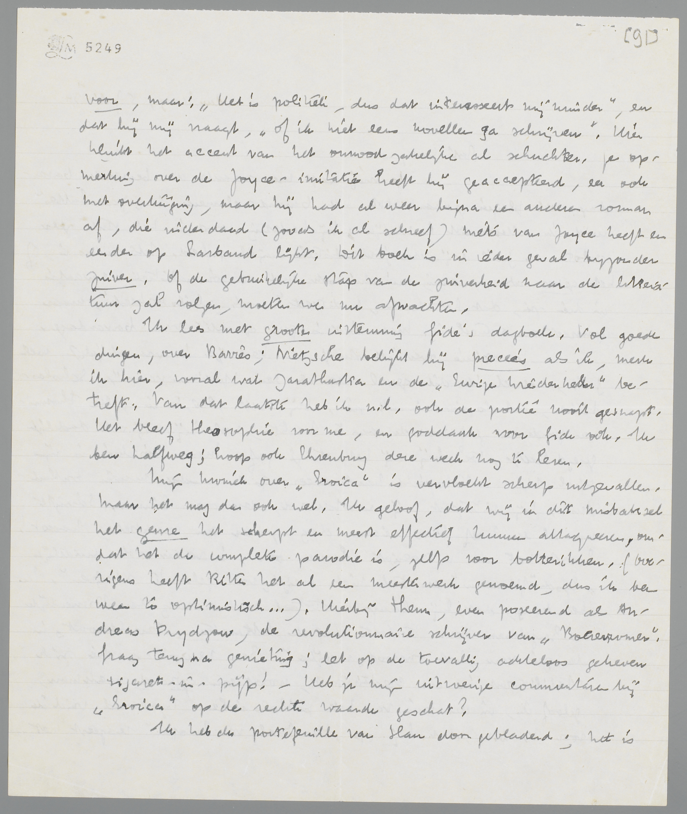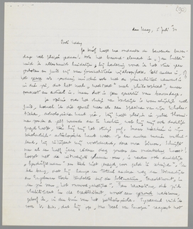 Ik lees met groote instemming Gide's dagboek. Vol goede dingen, over Barrès; Nietzsche bekijkt hij precies als ik, merk ik hier, vooral wat Zarathustra en de ‘Ewige Wiederkehr’ betreft. Van dat laatste heb ik n.l. ook de portée nooit gesnapt. Het bleef theosophie voor me, en goddank voor Gide ook. Ik ben halfweg; hoop ook Ehrenburg deze week nog te lezen.