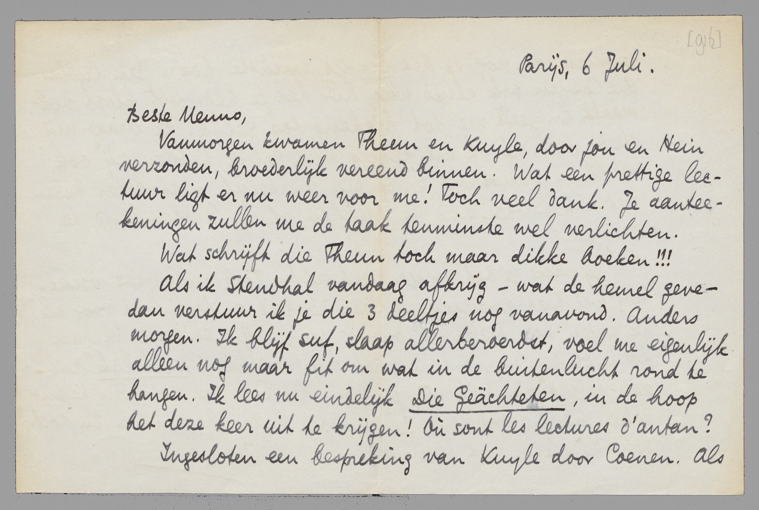 Vanmorgen kwamen Theun en Kuyle, door jou en Hein verzonden, broederlijk vereend binnen. Wat een prettige lectuur ligt er nu weer voor me! Toch veel dank. Je aanteekeningen zullen me de taak tenminste wel verlichten. Wat schrijft die Theun toch maar dikke boeken!!!