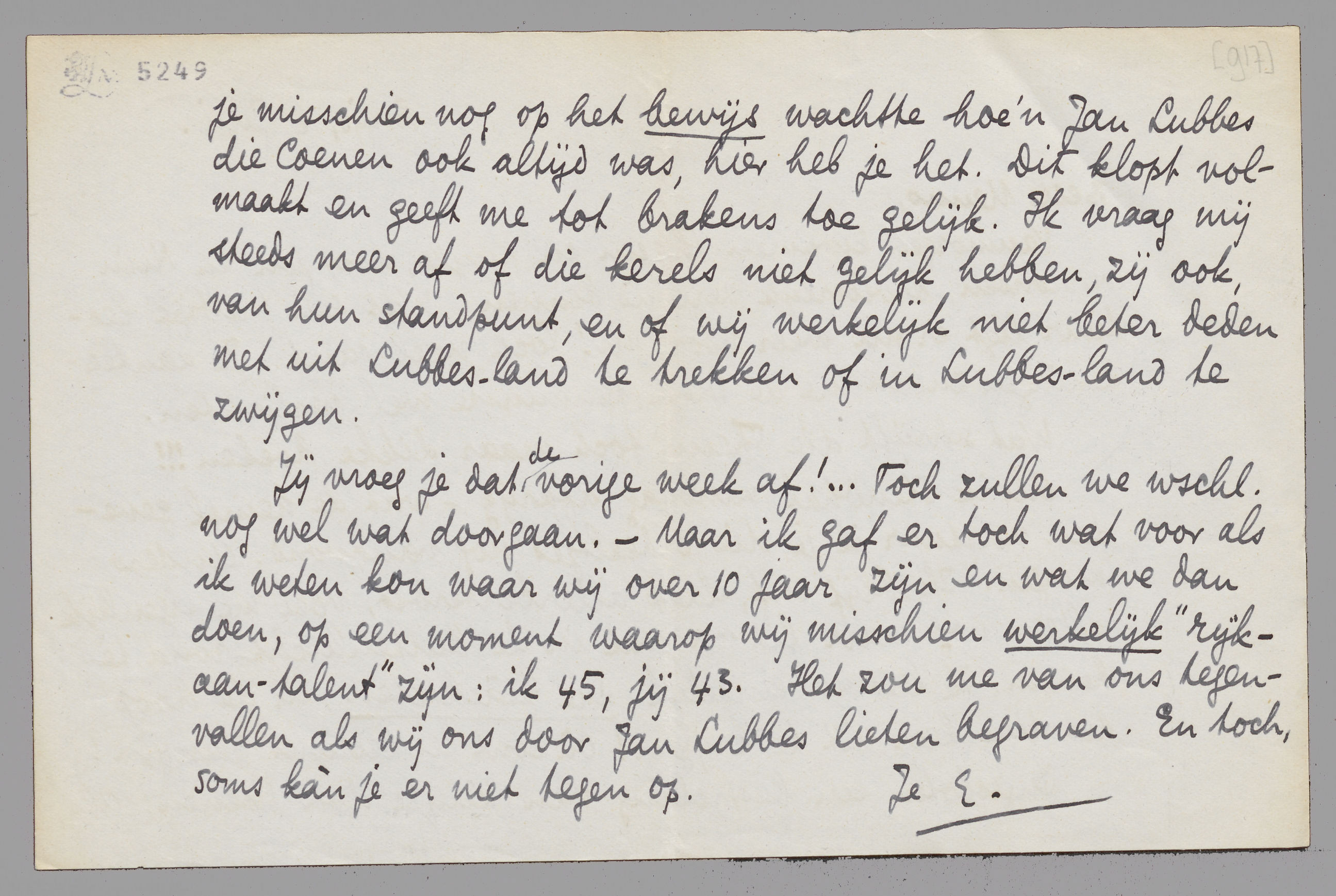 Jij vroeg je dat de vorige week af!... Toch zullen we wschl. nog wel wat doorgaan. - Maar ik gaf er toch wat voor als ik weten kon waar wij over 10 jaar zijn en wat we dan doen, op een moment waarop wij misschien werkelijk ‘rijk-aan-talent’ zijn: ik 45, jij 43. Het zou me van ons tegenvallen als wij ons door Jan Lubbes lieten begraven. En toch, soms kàn je er niet tegen op.