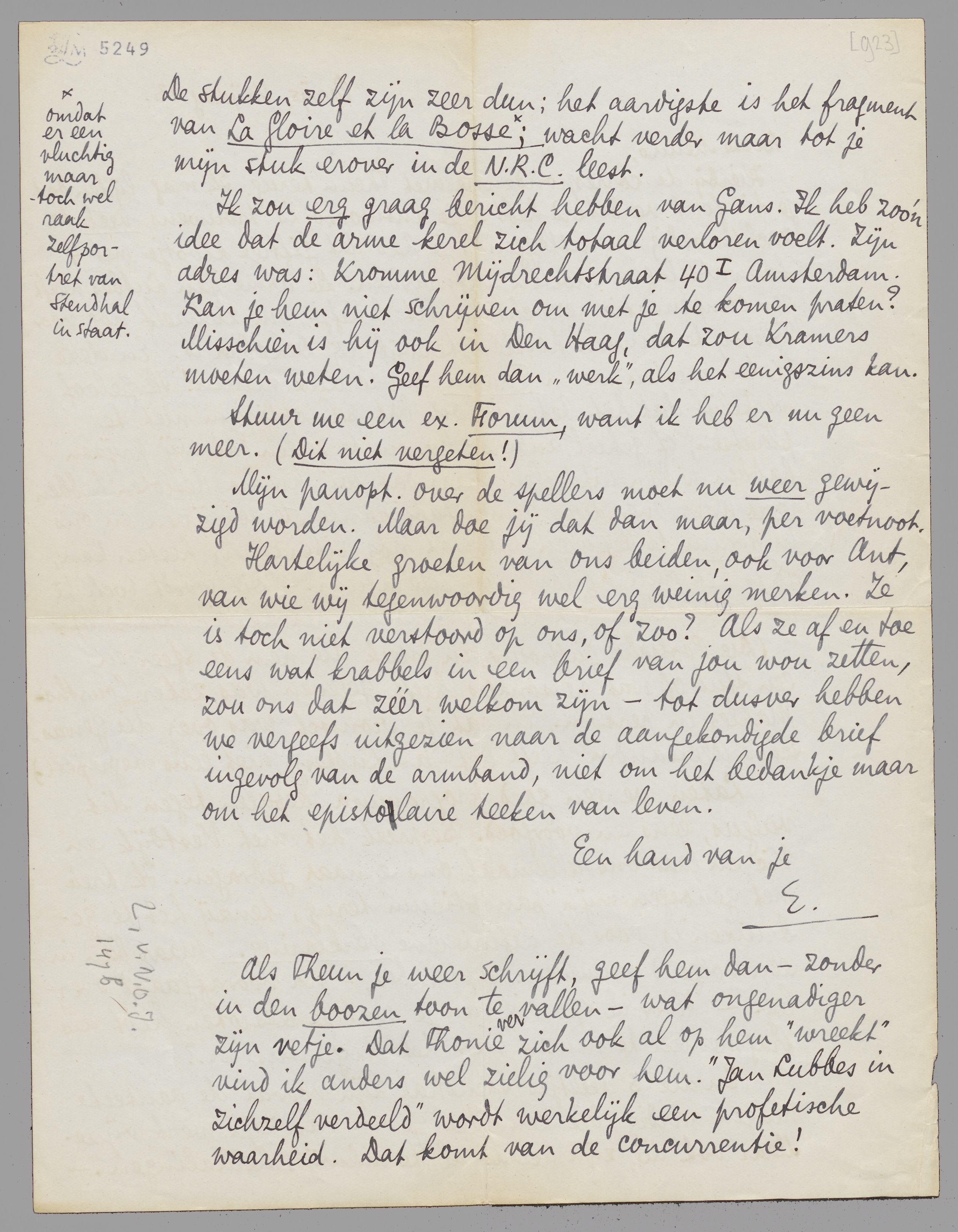 Hierbij de correspondentie met Theun terug. Ik mag lijden dat je die fout verbeterd hebt! Je antwoord is trouwens veel te zachtmoedig en uitleggend, je had dat giftige klootje met 4 karwatsslagen moeten antwoorden. De arme Jan Lubbes heeft een compensatie gezocht in dit briefje, om zichzelf nog voor Tolstoy te kunnen houden, terwijl hij Dekobra is. En deze lieden moeten we in Forum au sérieux nemen! Ik geloof werkelijk dat het beter is om dat panopticum niet te plaatsen, of geheel anders: bv. om te zeggen dat wij prijzen hadden willen uitdeelen, maar dat wij hierna besloten hebben nooit meer over deze romanfabrikanten te schrijven en ons in Forum te bepalen tot wat nog literatuur heeten kan, al is het dan hollandsche literatuur. - Dit wordt toch tè gek, want iedere Jan Lubbes gaat nu het heroïsche pad op.