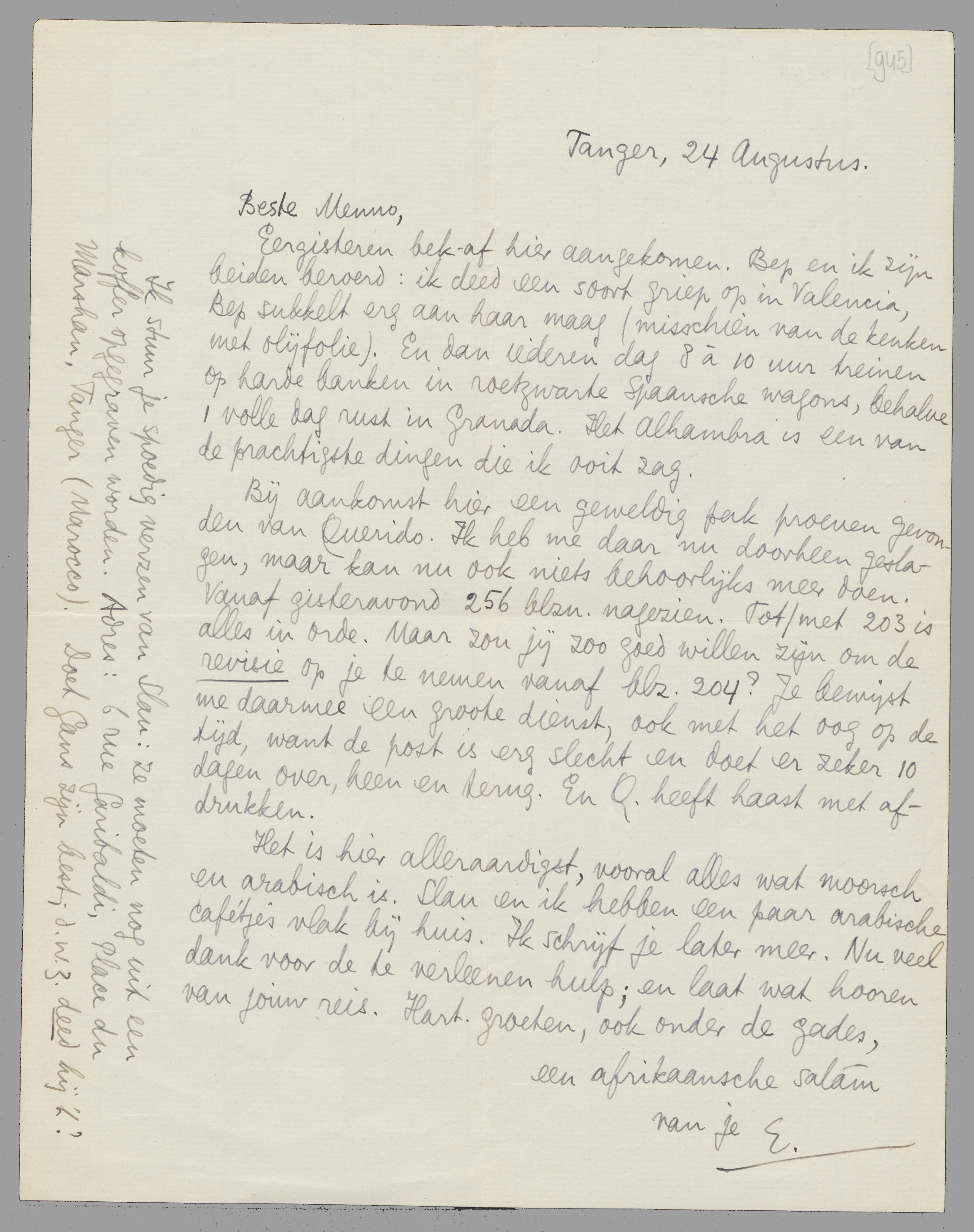 Het is hier alleraardigst, vooral alles wat moorsch en arabisch is. Slau en ik hebben een paar arabische cafétjes vlak bij huis. Ik schrijf je later meer. Nu veel dank voor de te verleenen hulp; en laat wat hooren van jouw reis. Hart. groeten, ook onder de gades, een afrikaansche salám van je