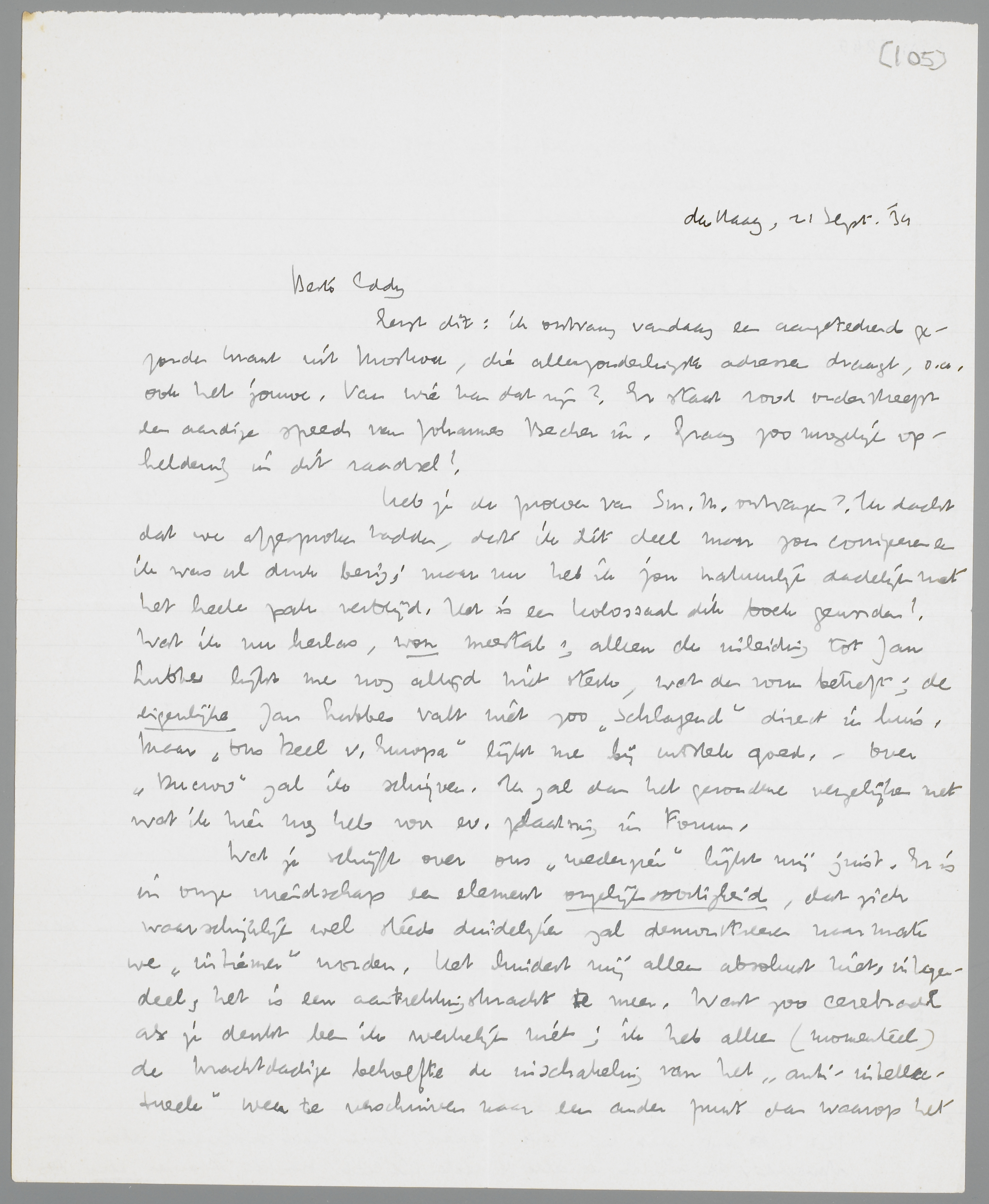 Eerst dit: ik ontvang vandaag een aangeteekend gezonden krant uit Moskou, die allerzonderlingste adressen draagt, o.a. ook het jouwe. Van wie kan dat zijn? Er staat rood onderstreept een aardige speech van Johannes Becher in. Graag zoo mogelijk opheldering in dit raadsel!