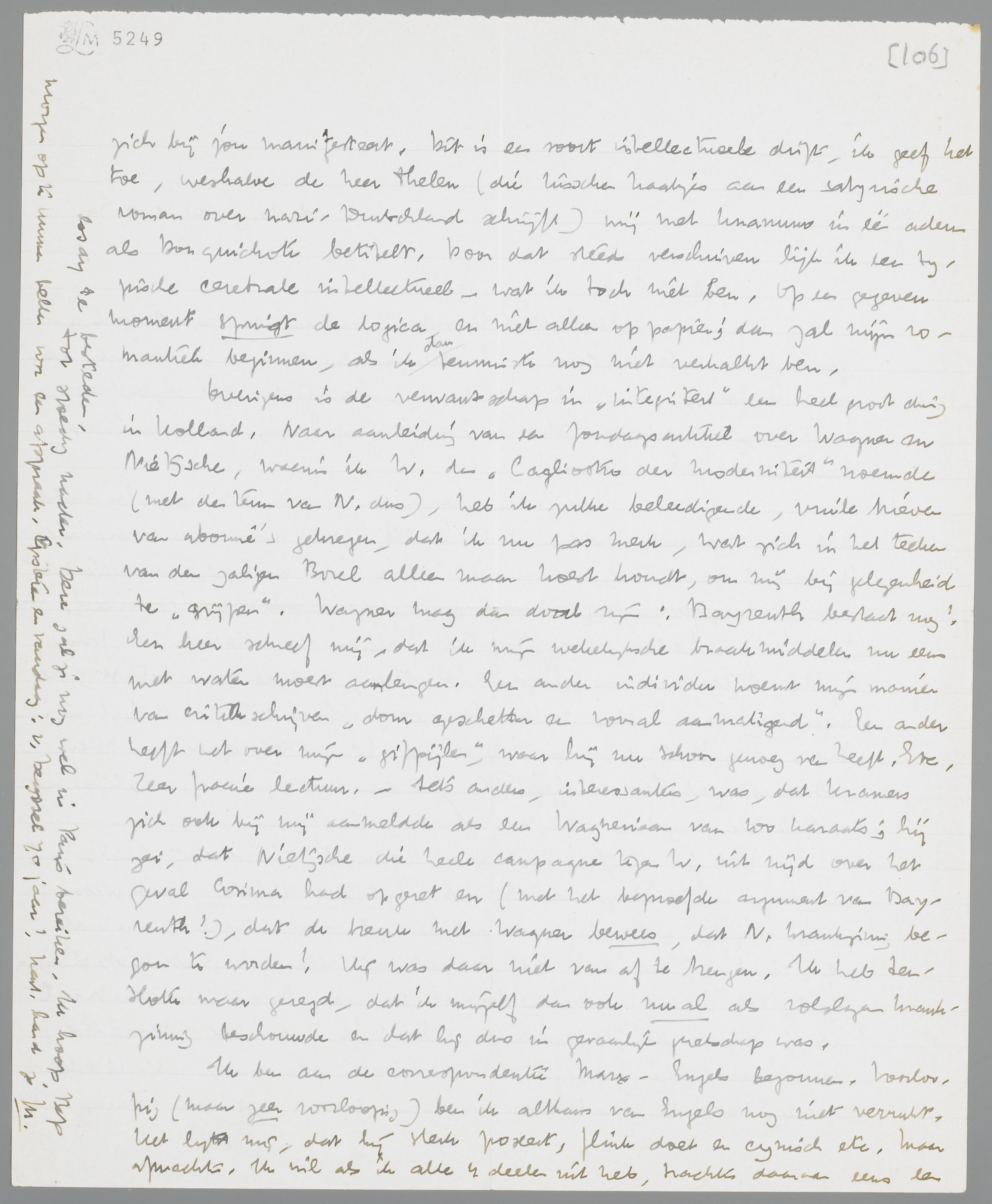 Overigens is de verwantschap in ‘integriteit’ een heel groot ding in Holland. Naar aanleiding van een Zondagsartikel over Wagner en Nietzsche, waarin ik W. den ‘Cagliostro der moderniteit’ noemde (met den term van N. dus), heb ik zulke beleedigende, vuile brieven van abonné's gekregen, dat ik nu pas merk, wat zich in het teeken van den zaligen Borel alleen maar koest houdt, om mij bij gelegenheid te ‘grijpen’. Wagner mag dan dood zijn: Bayreuth bestaat nog! Een heer schreef mij, dat ik mijn wekelijksche braakmiddelen nu eens met water moest aanlengen. Een ander individu noemt mijn manier van critiek schrijven ‘dom geschetter en vooral aanmatigend’. Een ander heeft het over mijn ‘gifpijlen’, waar hij nu schoon genoeg van heeft. Etc. Zeer fraaie lectuur. - Iets anders, interessanter, was, dat Kramers zich ook bij mij aanmeldde als een Wagneriaan van 100 karaats; hij zei, dat Nietzsche die heele campagne tegen W. uit nijd over het geval Cosima had opgezet en (met het beproefde argument van Bayreuth!), dat de breuk met Wagner bewees, dat N. krankzinnig begon te worden! Hij was daar niet van af te brengen. Ik heb tenslotte maar gezegd, dat ik mijzelf dan ook nu al als volslagen krankzinnig beschouwde en dat hij dus in gevaarlijk gezelschap was.
