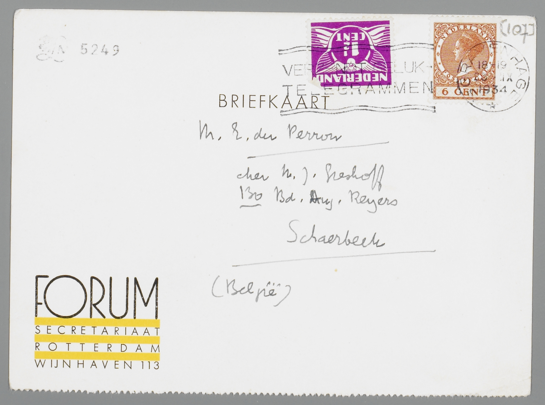 Je onverwacht vertrek naar Brussel brengt eenige verwarring. Want ik stuurde op je verzoek de proeven van de Sm. M. naar Parijs, benevens een nogal uitvoerige brief over een en ander. Misschien kun je je die stukken laten opzenden? Ik was al aan het corrigeeren geweest, maar was er mee opgehouden omdat je zelf om de proeven vroeg.