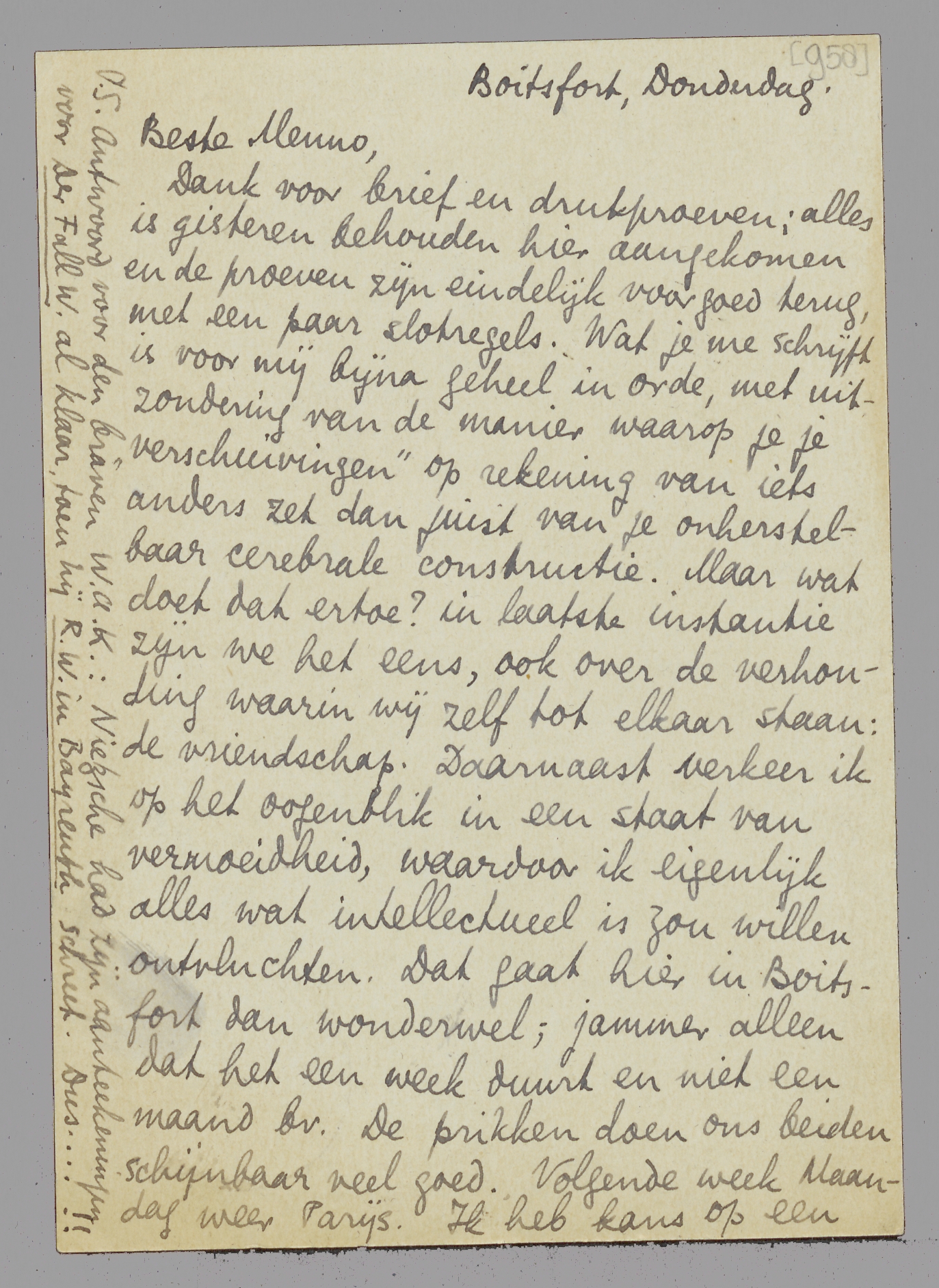 Dank voor brief en drukproeven: alles is gisteren behouden hier aangekomen en de proeven zijn eindelijk voor goed terug, met een paar slotregels. Wat je me schrijft is voor mij bijna geheel in orde, met uitzondering van de manier waarop je je ‘verschuivingen’ op rekening van iets anders zet dan juist van je onherstelbaar cerebrale constructie. Maar wat doet dat ertoe? in laatste instantie zijn wij het eens, ook over de verhouding waarin wij zelf tot elkaar staan: de vriendschap. Daar naast verkeer ik op het oogenblik in een staat van vermoeidheid, waardoor ik eigenlijk alles wat intellectueel is zou willen ontvluchten. Dat gaat hier in Boitsfort dan wonderwel; jammer alleen dat het een week duurt en niet een maand bv. De prikken doen ons beiden schijnbaar veel goed. Volgende week Maandag weer Parijs. Ik heb kans op een ‘baan’ aldaar bij de Utrecht; verkeer nog in twijfel, ofschoon het mij in menig opzicht aanlokt. Later meer. Sterkte tegen de domheid en steeds je