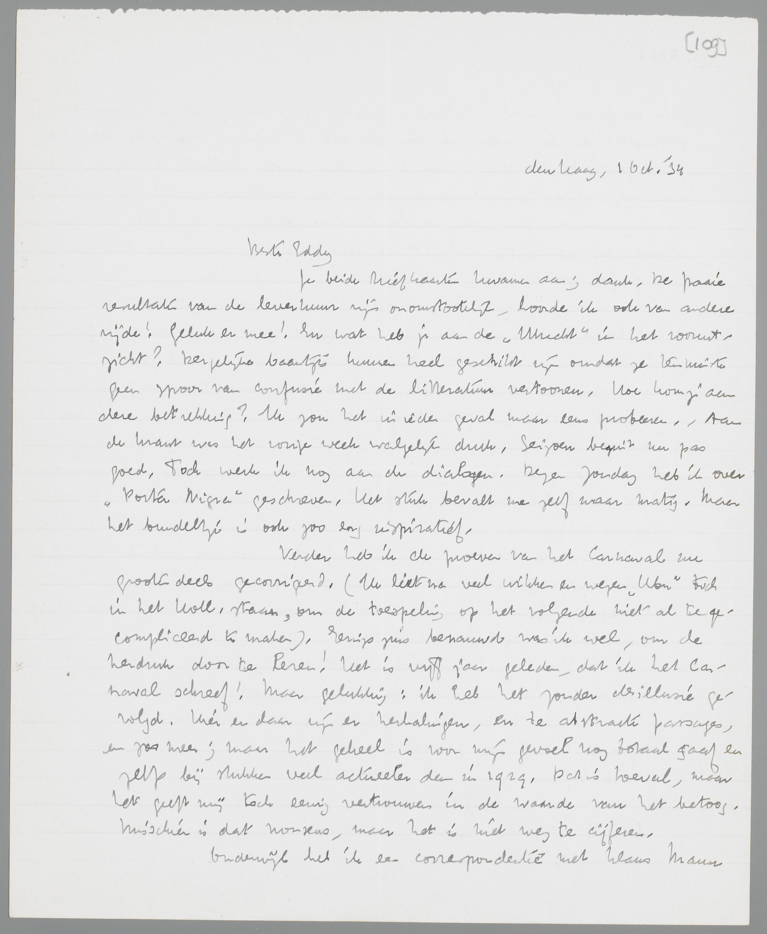 Onderwijl heb ik een correspondentie met Klaus Mann naar aanleiding van zijn Brontë-succes. Hij schreef mij nl. over een ev. ontmoeting en ik meende die toen het best te kunnen voorbereiden door hem even precies te vertellen, wat ik van die zusjes Brontë dacht. Hij heeft nu heel sympathiek, maar nog erg ‘ver verwijderd’ geantwoord, waarop ik hem nu nog eens van repliek heb gediend. Er is juist een nieuwe roman van hem uit. Flucht in den Norden, die ik je kan zenden, als je je voor den man interesseert. (Ik heb hem dubbel).