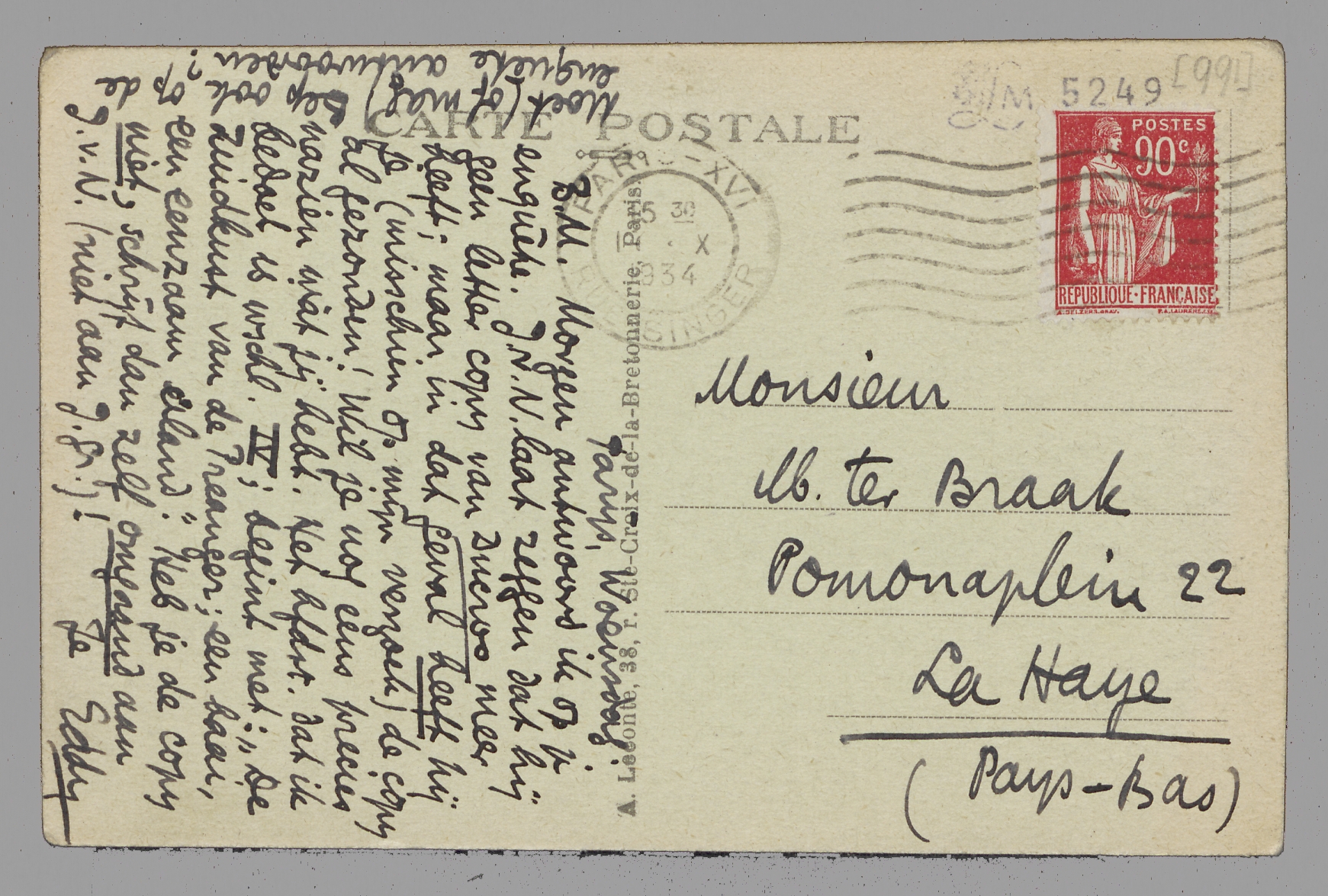 Morgen antwoord ik op je enquête. J.v.N. laat zeggen dat hij geen letter copy van Ducroo meer heeft; maar in dat geval heeft hij je (misschien op mijn verzoek) de copy al gezonden! Wil je nog eens precies nazien wàt jij hebt. Het hfdst. dat ik bedoel is wschl. IV; begint met: ‘De Zuidkust van Preanger; een baai, een eenzaam eiland’. Heb je de copy niet, schrijf dan zelf omgaand aan J.v.N. (niet aan J.Gr.)!