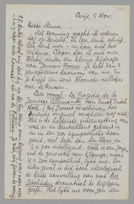 Lees vooral: La Tragédie de la Jeunesse Allemande van Ernst Erich Noth. (Bij Grasset verschenen, het duitsche origineel verscheen nog niet). Het is de helderste uiteenzetting van wat er in Duitschland gebeurd is, en in een zeer sympathieke toon geuit, véél beter dan Der Hass en 3 × zoo intelligent. Noth is een jongen uit de generatie van Klausje, maar 4 × zoo sympathiek, lijkt me. In ieder geval is dit boek ideologisch de beste aanvulling van wat Die Geächteten dramatisch te begrijpen geeft. Het lijkt me voor jou een voortreffelijke stof voor een preek. Stuur je me je preeken nog?