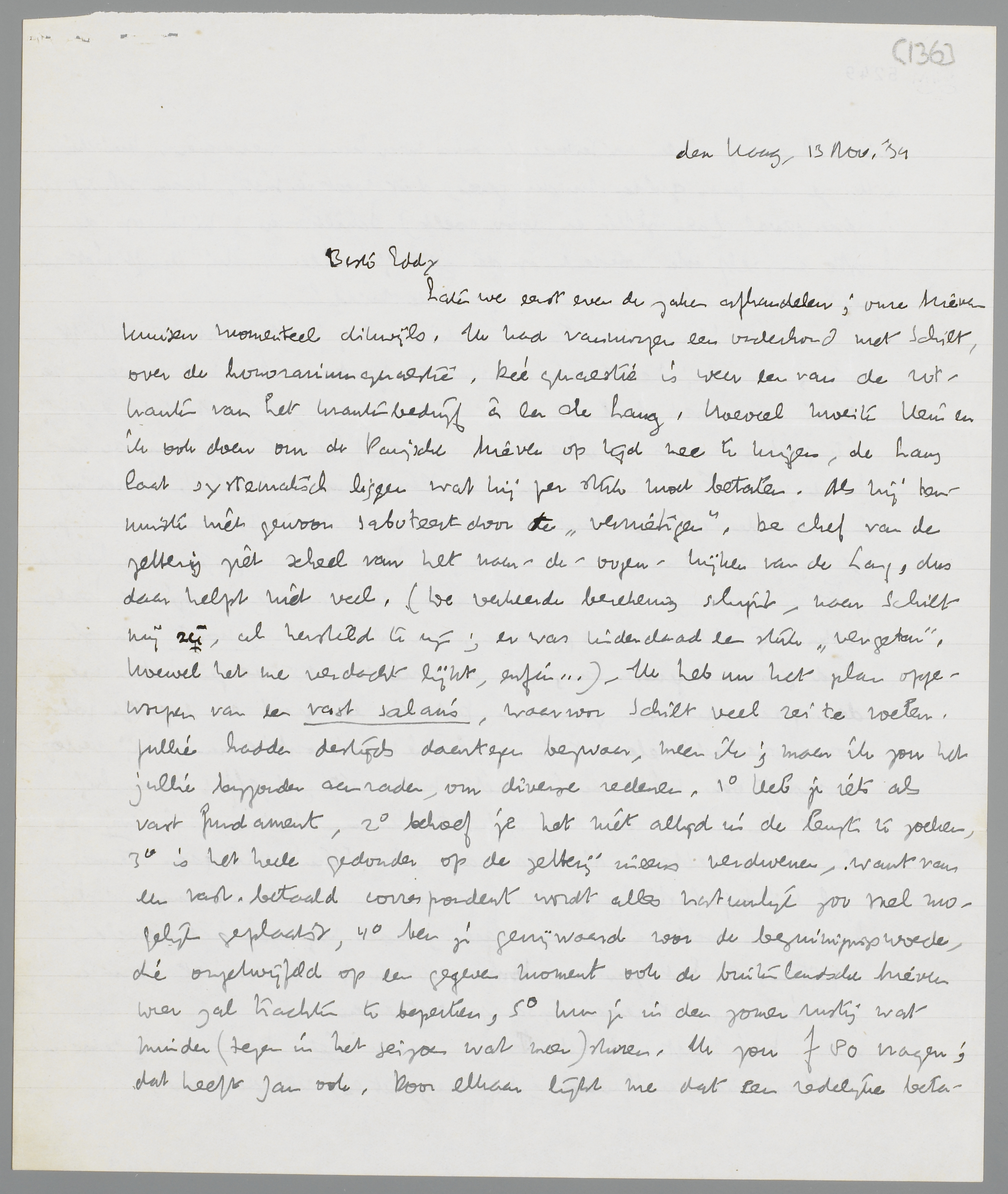 Laten we eerst even de zaken afhandelen; onze brieven kruisen momenteel dikwijls. Ik had vanmorgen een onderhoud met Schilt, over de honorariumquaestie. Die quaestie is weer een van de rotkanten van het krantenbedrijf à la de Lang. Hoeveel moeite Hein en ik ook doen om de Parijsche brieven op tijd mee te krijgen, de Lang laat systematisch liggen wat hij per stuk moet betalen. Als hij tenminste niet gewoon saboteert door te ‘vernietigen’. De chef van de zetterij ziet scheel van het naar-de-oogen-kijken van de Lang, dus daar helpt niet veel. (De verkeerde berekening schijnt, naar Schilt mij zei, al hersteld te zijn; er was inderdaad een stuk ‘vergeten’. Hoewel het me verdacht lijkt, enfin...) - Ik heb nu het plan opgeworpen van een vast salaris, waarvoor Schilt veel zei te voelen. Jullie hadden destijds daartegen bezwaar, meen ik; maar ik zou het jullie bijzonder aanraden, om diverse redenen. 1o Heb je iets als vast fundament, 2o behoef je het niet altijd in de lengte te zoeken, 3o is het heele gedonder op de zetterij ineens verdwenen, want van een vast-betaald correspondent wordt alles natuurlijk zoo snel mogelijk geplaatst, 4o ben je gevrijwaard voor de bezuinigingswoede, die ongetwijfeld op een gegeven moment ook de buitenlandsche brieven weer zal trachten te beperken, 5o kun je in den zomer rustig wat minder (tegen in het seizoen wat meer) sturen. Ik zou f 80 vragen; dat heeft Jan ook. Door elkaar lijkt me dat een redelijke betaling, al zou je in een wintermaand soms meer kunnen verdienen. Misschien willen ze een paar gulden minder geven, dat weet ik niet. Maar schrijf er in ieder geval (als jullie er voor voelt) Schilt over; hij is op de hoogte en zelf ook woedend op de zetterij, alleen... hij durft niet en zoekt dus ook al naar zulke afleidende middelen.