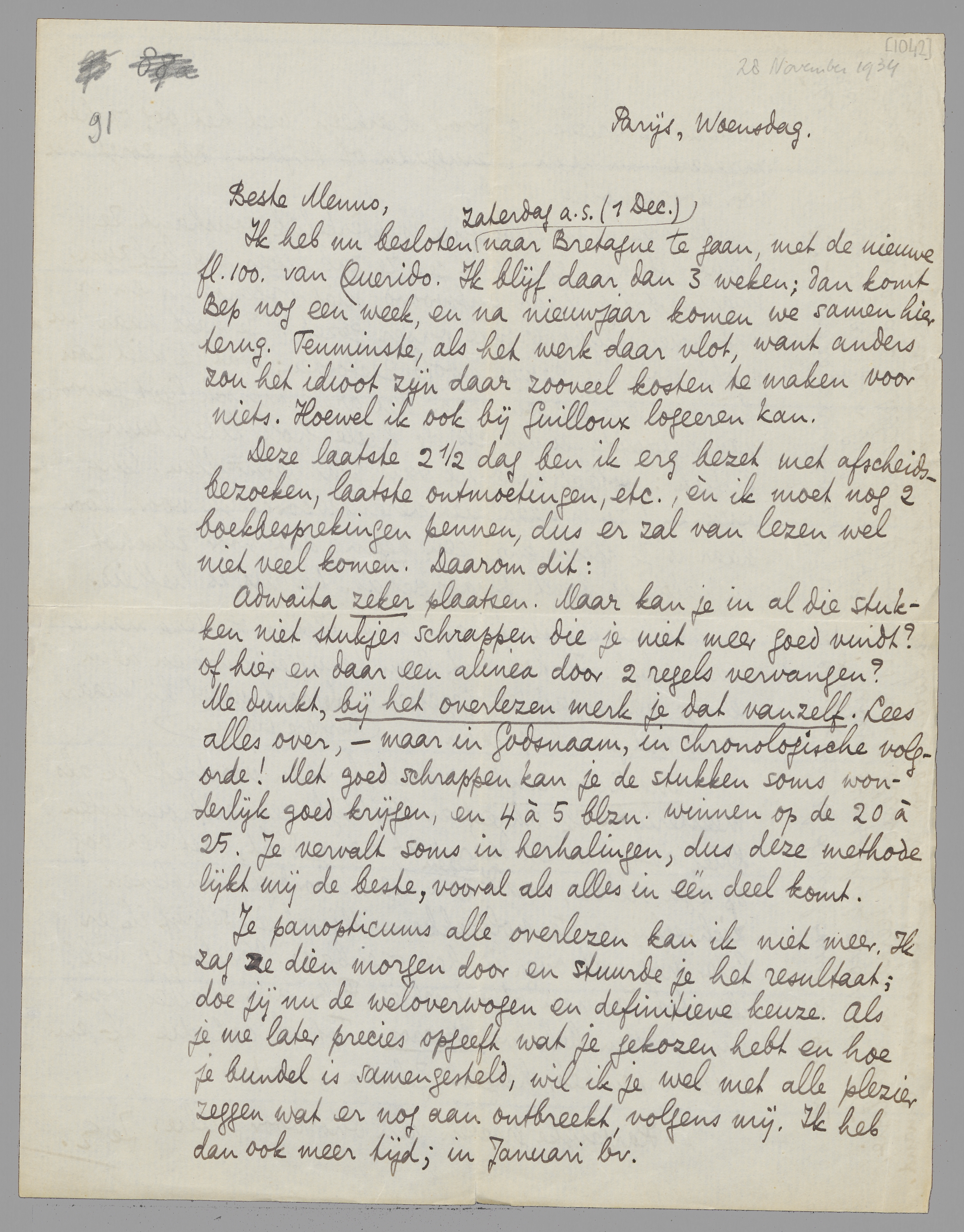 Ik heb nu besloten Zaterdag a.s. (1 Dec). naar Bretagne te gaan, met de nieuwe fl. 100. - van Querido. Ik blijf daar dan 3 weken; dan komt Bep nog een week, en na nieuwjaar komen we samen hier terug. Tenminste, als het werk daar vlot, want anders zou het idioot zijn daar zooveel kosten te maken voor niets. Hoewel ik ook bij Guilloux logeeren kan.