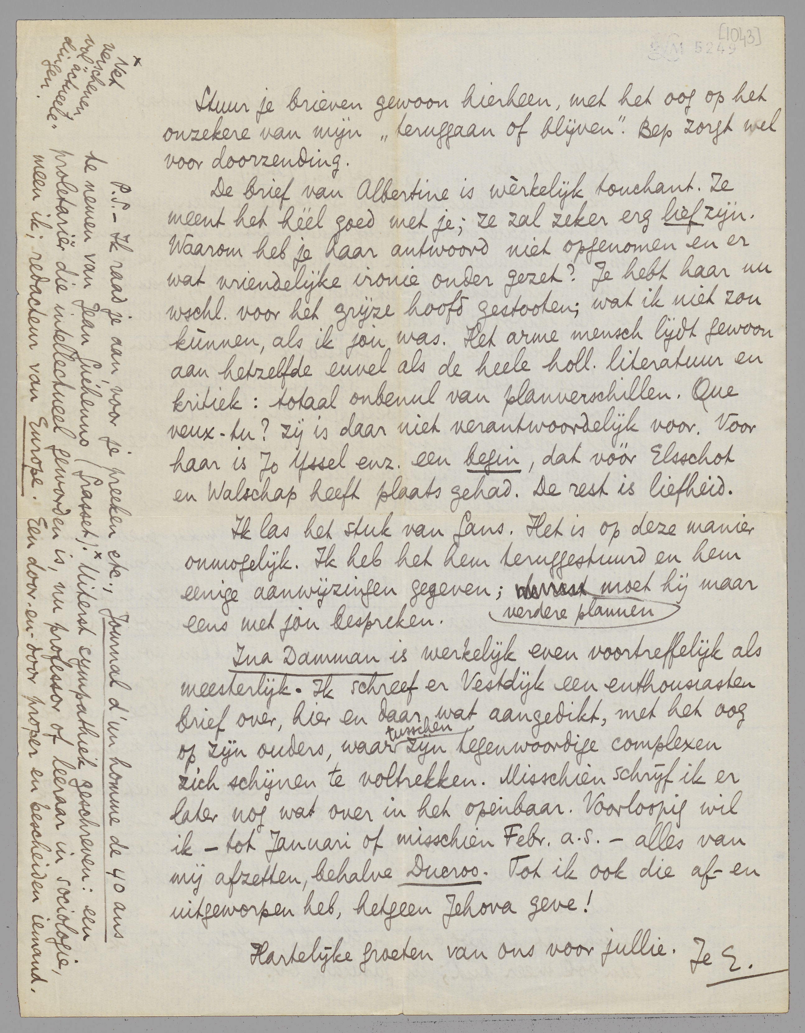 De brief van Albertine is wèrkelijk touchant. Ze meent het héél goed met je; ze zal zeker erg lief zijn. Waarom heb je haar antwoord niet opgenomen en er wat vriendelijke ironie onder gezet? Je hebt haar nu wschl. voor het grijze hoofd gestooten; wat ik niet zou kùnnen, als ik jou was. Het arme mensch lijdt gewoon aan hetzelfde euvel als de heele holl. literatuur en kritiek: totaal onbenul van planverschillen. Que veux-tu? zij is daar niet verantwoordelijk voor. Voor haar is Jo IJssel enz. een begin, dat vóór Elsschot en Walschap heeft plaats gehad. De rest is liefheid.