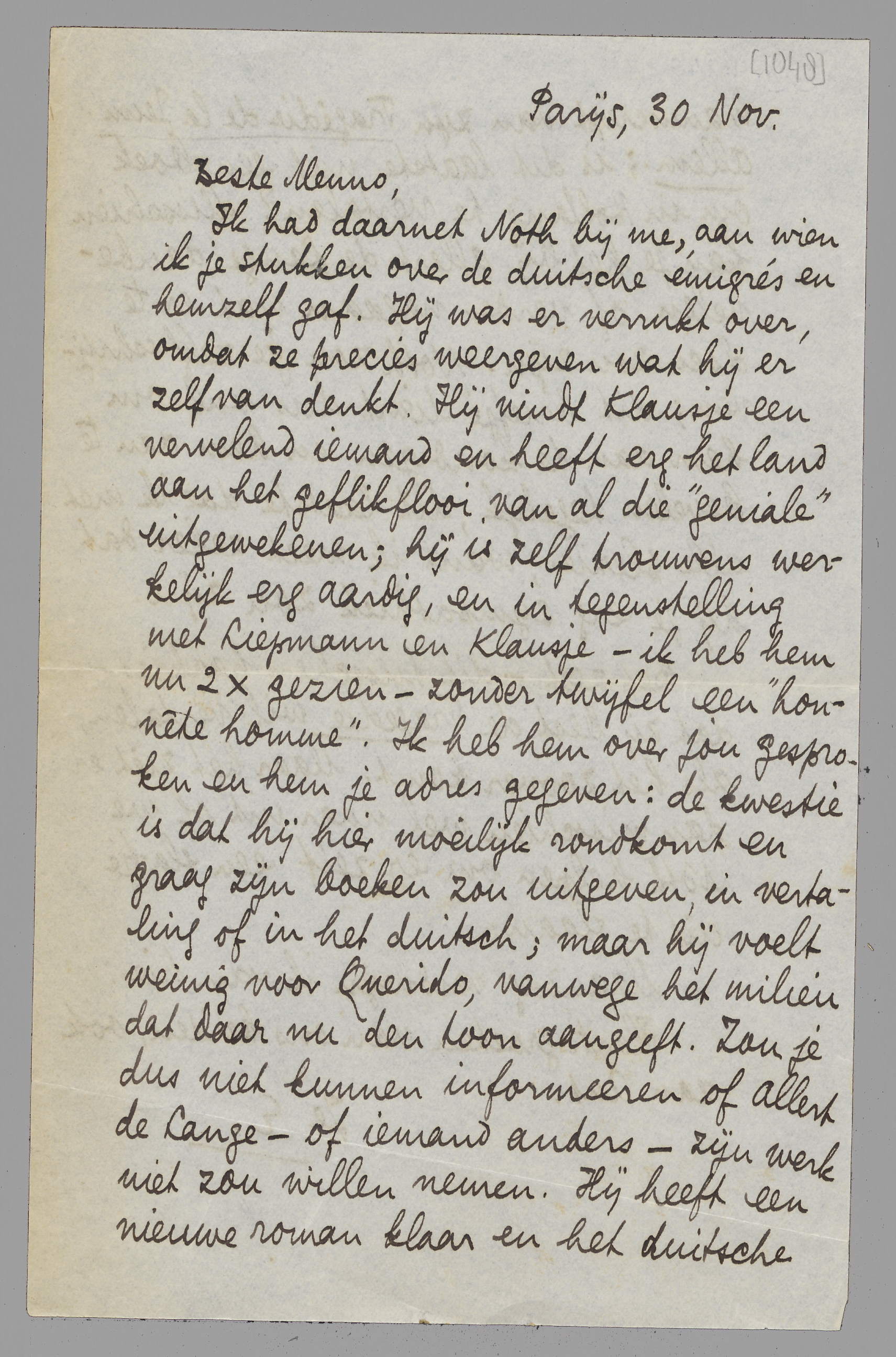 Ik had daarnet Noth bij me, aan wien ik je stukken over de Duitsche emigrés en hemzelf gaf. Hij was er verrukt over, omdat ze precies weergeven wat hij er zelf van denkt. Hij vindt Klausje een vervelend iemand en heeft erg het land aan het geflikflooi, van al die ‘geniale’ uitgewekenen; hij is zelf trouwens werkelijk erg aardig, en in tegenstelling met Liepmann en Klausje - ik heb hem nu 2 × gezien - zonder twijfel een ‘honnête homme’. Ik heb hem over jou gesproken en hem je adres gegeven: de kwestie is dat hij hier moeilijk rondkomt en graag zijn boeken zou uitgeven, in vertaling of in het duitsch; maar hij voelt weinig voor Querido, vanwege het milieu dat daar nu den toon aangeeft. Zou je dus niet kunnen informeeren of Allert de Lange - of iemand anders - zijn werk niet zou willen nemen. Hij heeft een nieuwe roman klaar en het duitsche manuscript van zijn Tragédie de la Jeun. Allem.; is dit laatste niet een boek om in Holland te vertalen? Misschien kan je het bij Allert de Lange aanbevelen, of verder nagaan wat er te doen zou zijn. Noth zou je zelf schrijven; dit briefje dient dus vnl. om hem aan te kondigen en hem aan te bevelen tegelijk, dit laatste doe ik met alle plezier, want ik weet zeker dat hij je erg sympathiek zou zijn.