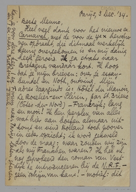 Heel veel dank voor het nieuwe ex. Carnaval, met de voor de 4e × herschreven opdracht, die ditmaal werkelijk keurig overgekomen is en mij danig heeft geroerd. Ik ga straks naar Bretagne, vandaar kort. Ik hoop dat je mijn brieven: over je essaybundel en Noth, ontving. Mijn adres daarginds is: Hôtel du Manoir, Le Roselier-en-Plérin, par St. Brieuc (Côtes-du-Nord)-Frankrijk; lang en mooi! Ik ben perplex van alles wat hier aan boeken alsmaar uitkomt en vind Holland toch poover in ieder opzicht; ik word gekweld door de vraag: waar zouden wij zijn als wij Franschen waren? Ik heb nl. nog geprobeerd den roman van Vestdijk te introduceeren bij de N.R.F. - geen schijn van kans! - motief: dit onderwerp is al eens eerder behandeld. Bovendien vindt Malraux een boek als Fermina Marquez ongeveer nix, waarin hij eindeloos ongelijk heeft. Maar de heele Larbaud kan bij de N.R.F. niet in een behoorlijke uitgave verschijnen! - Ik raad je aan in het laatste nr. van de N.R.F. te lezen wat Suarès over Mein Kampf zegt; het is om in extenso te vertalen in Het Vad. Zijn boek is anders wel erg faciel en een beetje idioot ‘fransch’.
