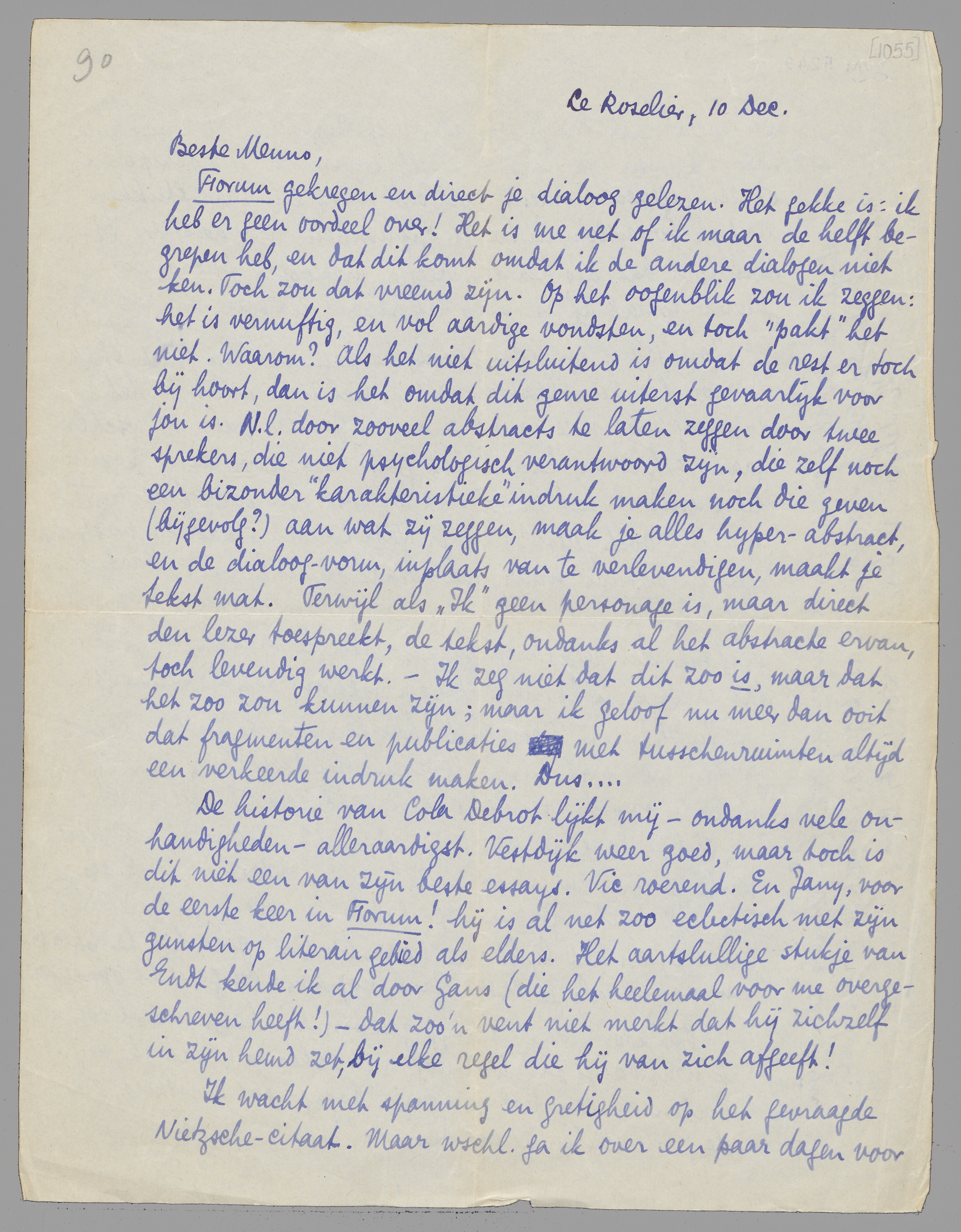 Forum gekregen en direct je dialoog gelezen. Het gekke is: ik heb er geen oordeel over! Het is me net of ik maar de helft begrepen heb, en dat dit komt omdat ik de andere dialogen niet ken. Toch zou dat vreemd zijn. Op het oogenblik zou ik zeggen: het is vernuftig, en vol aardige vondsten, en toch ‘pakt’ het niet. Waarom? Als het niet uitsluitend is omdat de rest er toch bij hoort, dan is het omdat dit genre uiterst gevaarlijk voor jou is. N.l. door zooveel abstracts te laten zeggen door twee sprekers, die niet psychologisch verantwoord zijn, die zelf noch een bijzonder ‘karakteristieke’ indruk maken noch die geven (bijgevolg?) aan wat zij zeggen, maak je alles hyper-abstract, en de dialoog-vorm, inplaats van te verlevendigen, maakt je tekst mat. Terwijl als ‘Ik’ geen personage is, maar direct den lezer toespreekt, de tekst, ondanks al het abstracte ervan, toch levendig werkt. - Ik zeg niet dat dit zoo is, maar dat het zoo zou kunnen zijn; maar ik geloof nu meer dan ooit dat fragmenten en publicaties met tusschenruimten altijd een verkeerde indruk maken. Dus...